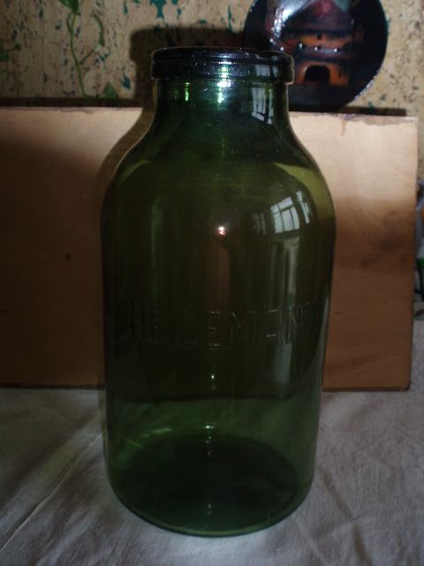 zelena, staklena tegla sa natpisom na tijelu Heilemann, na poklopcu Bulach Universal, visine 33 cm, širine postolja 16,5 cm, širine otvora 10 cm, u besprijekornom stanju.