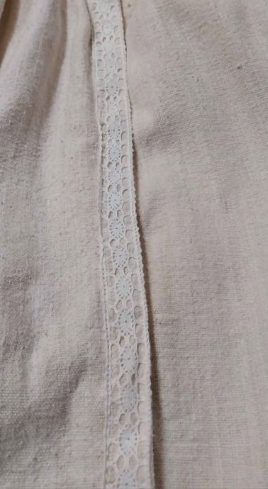 Ženska narodna nošnja od originalnog domaćeg platna. Dimenzije: haljina (janjka) -duljina 108 cm,dužina leđa 36 cm. Košulja(oplećak) 37 cm duljina straga,57 cm duljina sprijeda, duljina rukava 65 cm. Pregača duljinab73 cm. Sve u vrlo dobrom stanju.