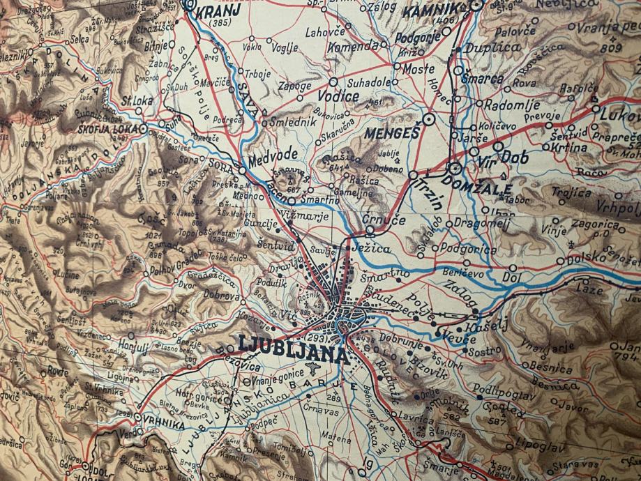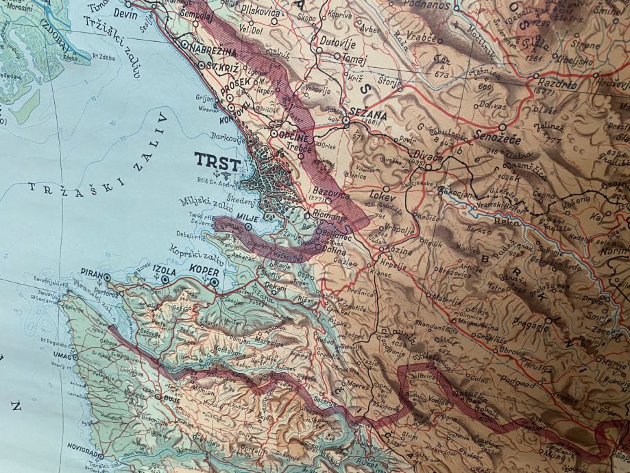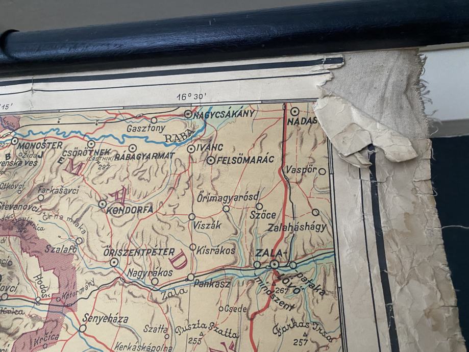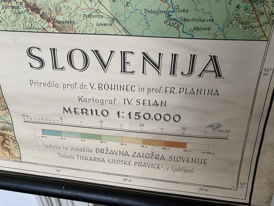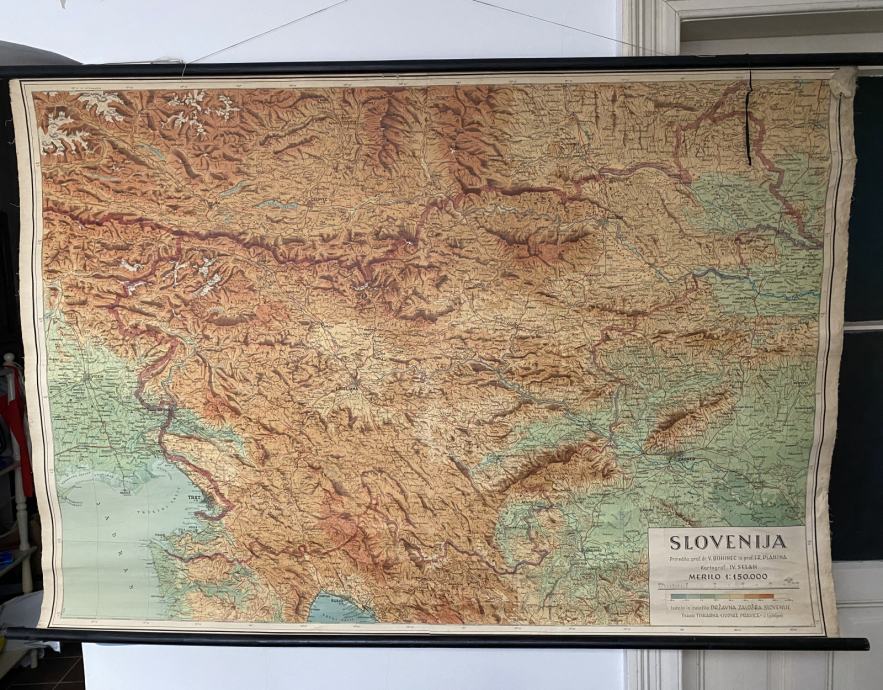 Prodajem staru geografsku zidnu kartu Narodne Republike Slovenije. Proizvedena u Sloveniji, prema kartografskom prikazu Zagreba otprilike ranih 1950-ih. Stanje vrlo dobro očuvano, originalne drvene letvice u vrlo dobrom stanju.