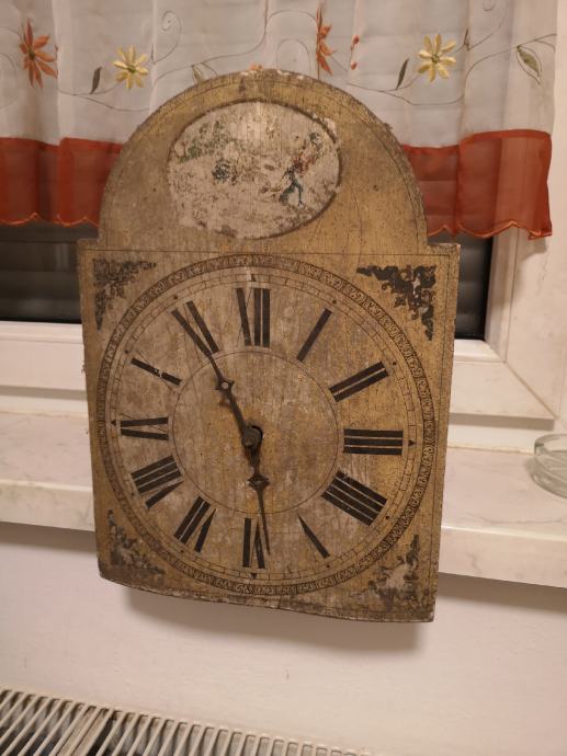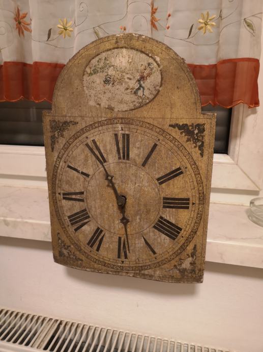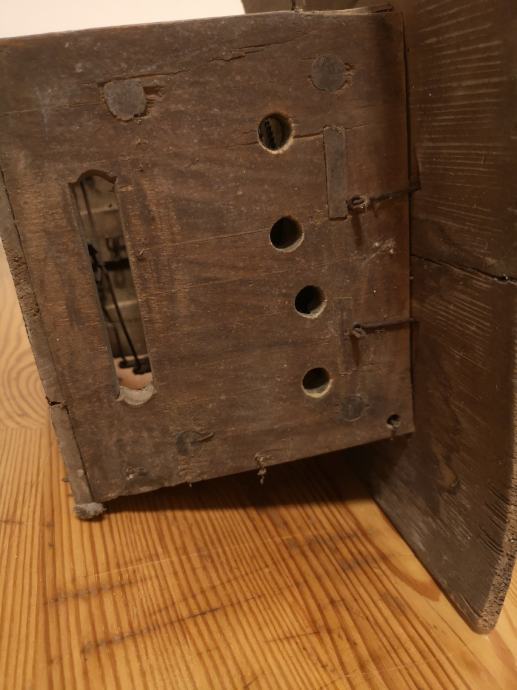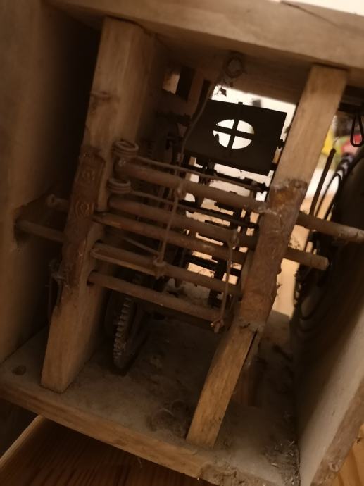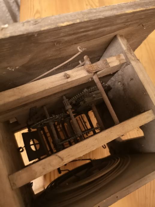 Veliki Zidni jako star sat drveno kučište, metalni mehanizam vidi se na slikama fale utezi i i lanac