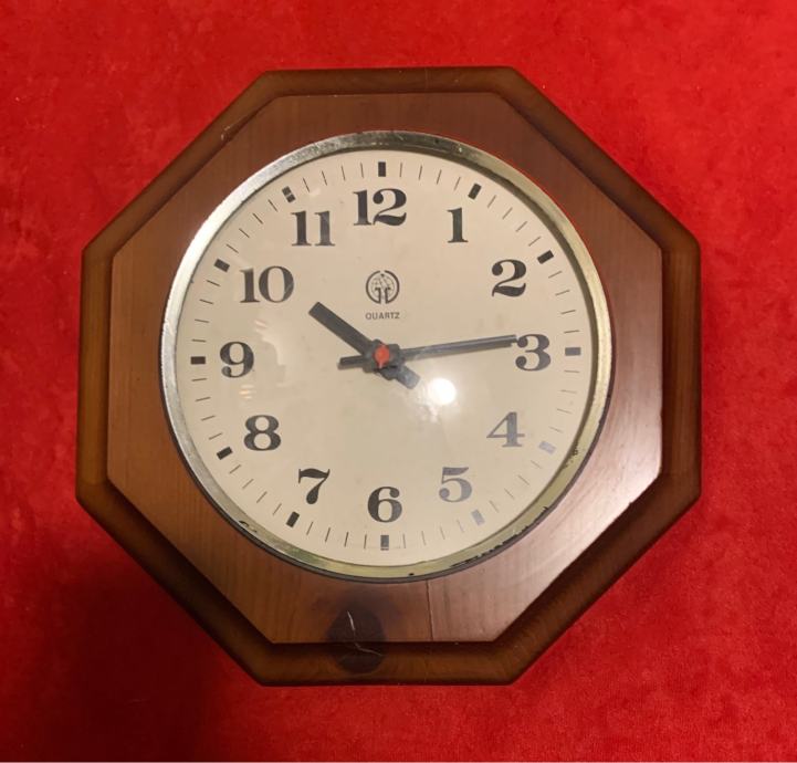 Zidni sat iz sedamdesetih godina, kvarc sa baterijom mali amerikanac, drveni okvir ,odlicno stanje