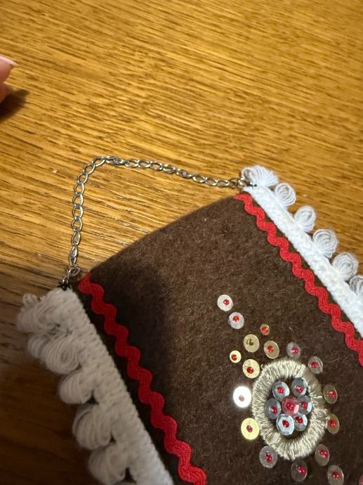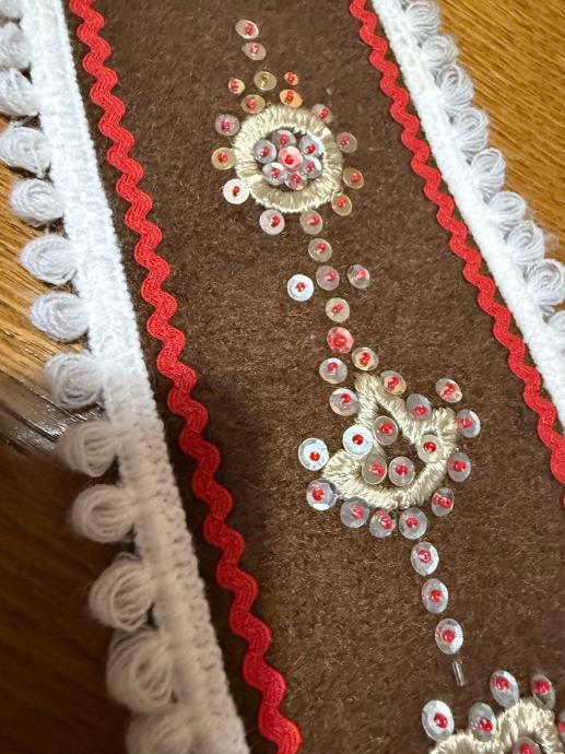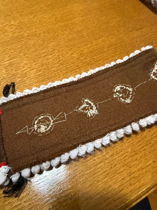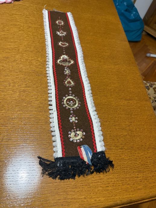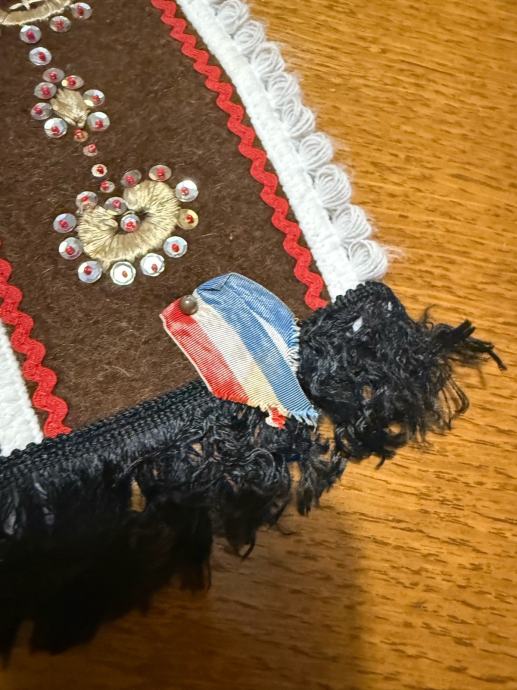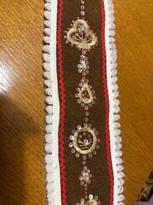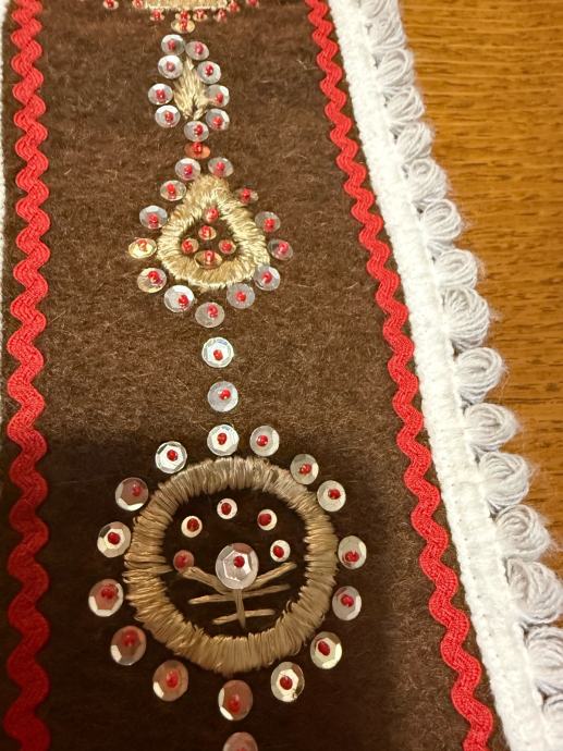 Dekorativni zidnjak izrađen od čvrstog tamnog platna s bogatim ručnim vezom. Ukrašen aplikacijama, šljokicama i ukrasnim trakama u crvenoj i bijeloj boji. Donji dio ima rese, a gore metalni lančić za vješanje.