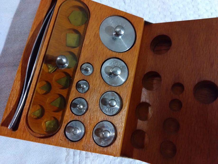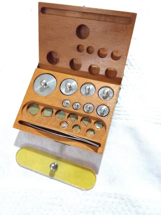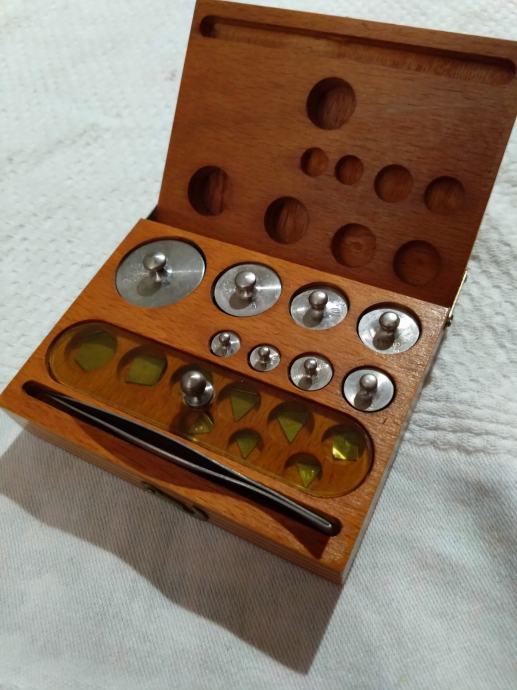 Komplet se sastoji od 50g, 20g, 10g(2x), 5g, 2g, 1g(2x), 500mg, 200mg, 100mg(2x), 50mg, 10mg(3x) + pinceta.