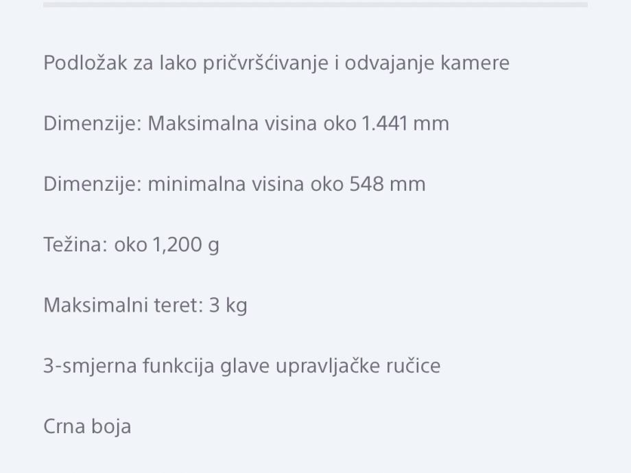 prodajem Sony stativ za kameru i fotoapart VCT-R640 crne boje, nije korišten, u odličnom stanju kao novi. Maksimalna visina oko 1441mm, minimalna visina oko 548mm srednja visina oko 800mm. Težina oko 1200g, maksimalan teret 3kg.