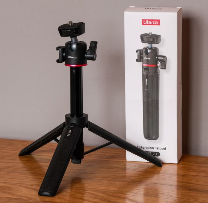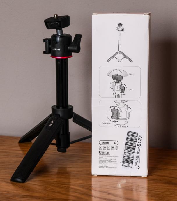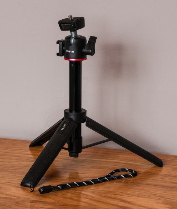 prenosiv mini stativ sklopljen dužine 20 cm s maksimalnom visinom od 55 cm, kuglastom glavom od 360° i univerzalnom 1/4" priključnicom.