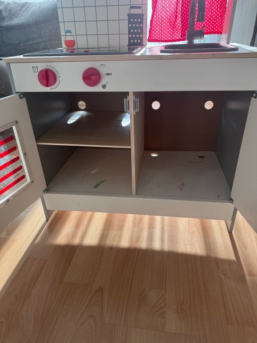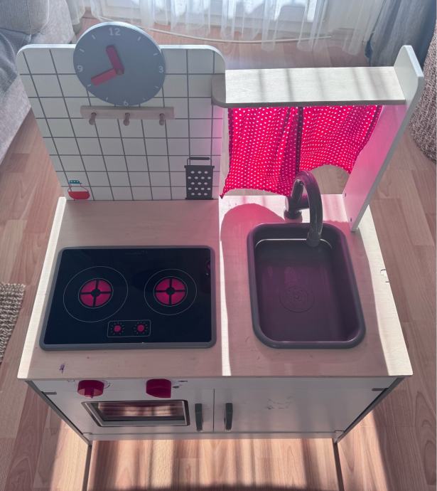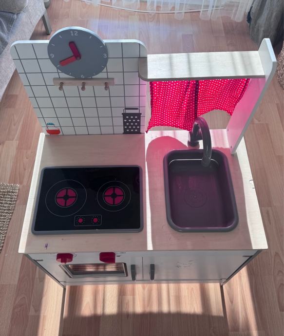 Prodajem dječju kuhinju u bijeloj boji s crvenim detaljima. Kuhinja ima ploču za kuhanje s dvije zone, pećnicu s vratima i plastikom, sudoper sa slavinom te prostor za odlaganje s otvorenim policama. Na gornjem dijelu nalazi se backsplash s iscrtanim pločicama, sat, te crvene zavjese na točkice. Kuhinja ima gumbe za upravljanje i dovoljno prostora za igračke posuđe i pribor.