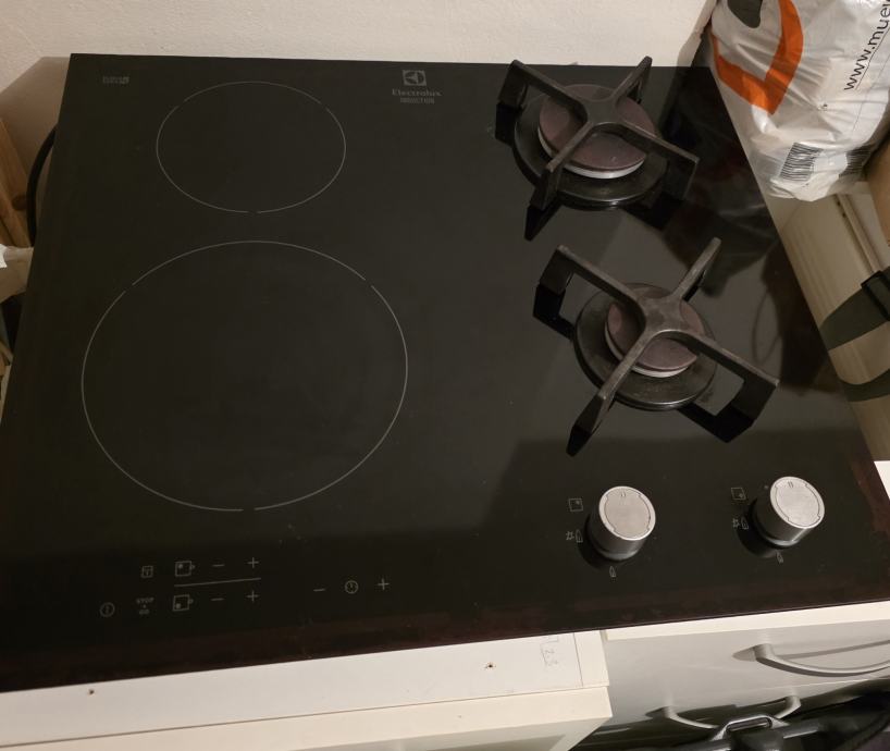 Prodajem Electrolux kombiniranu ploču za kuhanje na plin i indukciju model EGD6576NOK. Ploča ima dvije indukcijske zone s lijeve strane i dva plinska plamenika s desne strane. Crna staklena površina s touch control upravljanjem na indukcijskom dijelu i okretnim gumbima za plin. Ploča je u potpunosti očuvana i ispravna.
