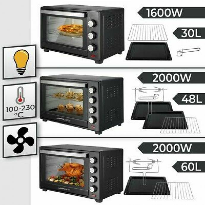 Kvaliteta kuhanja ne bi trebala trpjeti ako nemate puno prostora. Ovaj kuhinjski aparat upravo je pravo rješenje za male kuhinje. S izlaznom snagom od 1600 W i kapacitetom od 30 litara, naša mini pećnica pomoći će vam u postizanju izvrsnih rezultata kuhanja. Crno kućište savršeno se uklapa u bilo koju vrstu kuhinjskog postavljanja u vašim studio apartmanima, spavaonicama, kamp kućicama i drugim malim kućama. Zahvaljujući postavkama timera, nikada više nećete sagorjeti hranu.