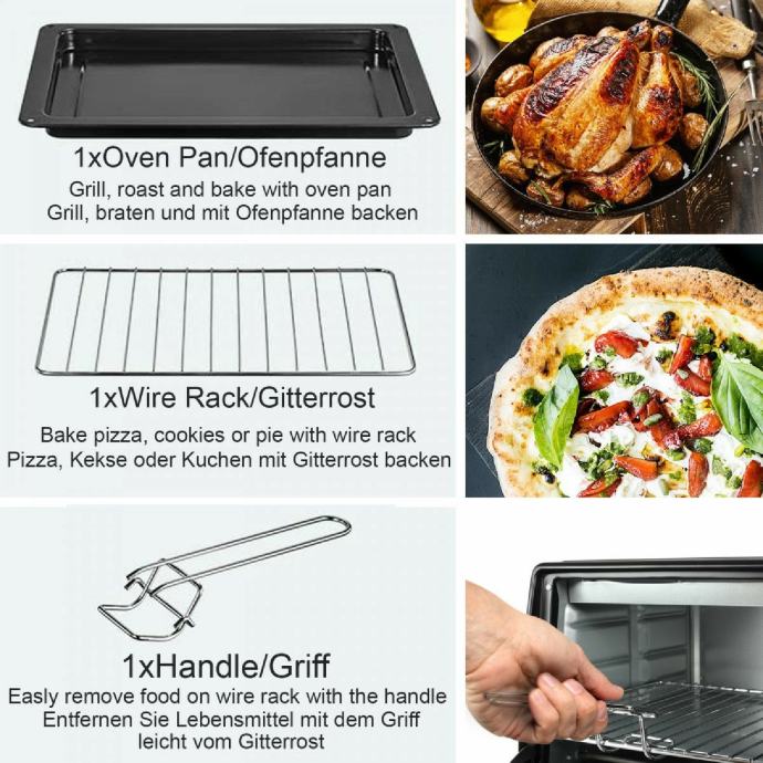 Funkcije: termostat, 60-minutni mjerač vremena s funkcijom automatskog isključivanja, unutarnje osvjetljenje (i rotacijski roštilj)
