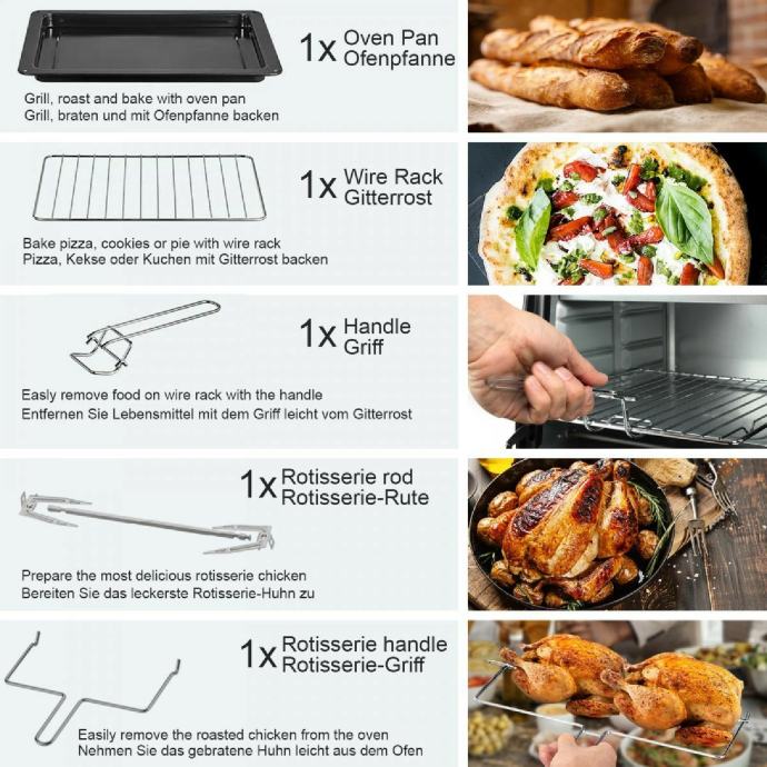 s priborom (rešetka, 2 posude za pečenje i ručke, kao i set rotisserie)