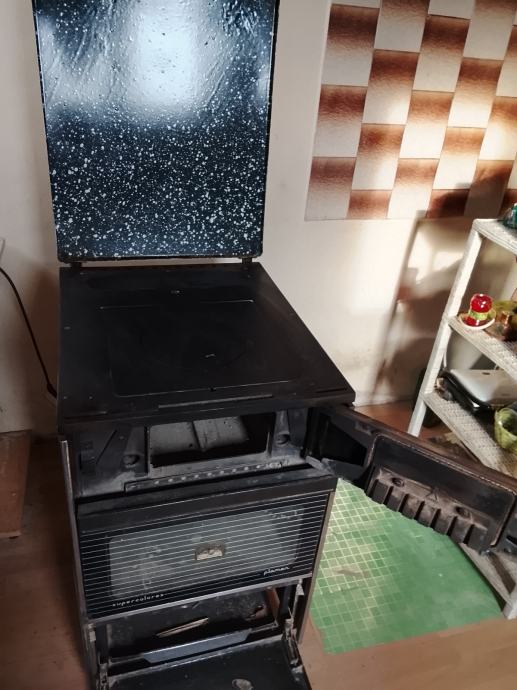 Prodajem pećnicu na drva s metalnim kućištem i staklenim poklopcem. Pećnica ima više razina, uključujući prostor za ogrjev drvima i gornju ploču za kuhanje s otvorima za lonac. Funkcionalna je i pogodna za grijanje ili pripremu hrane na tradicionalan način.