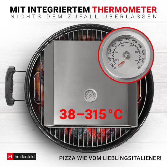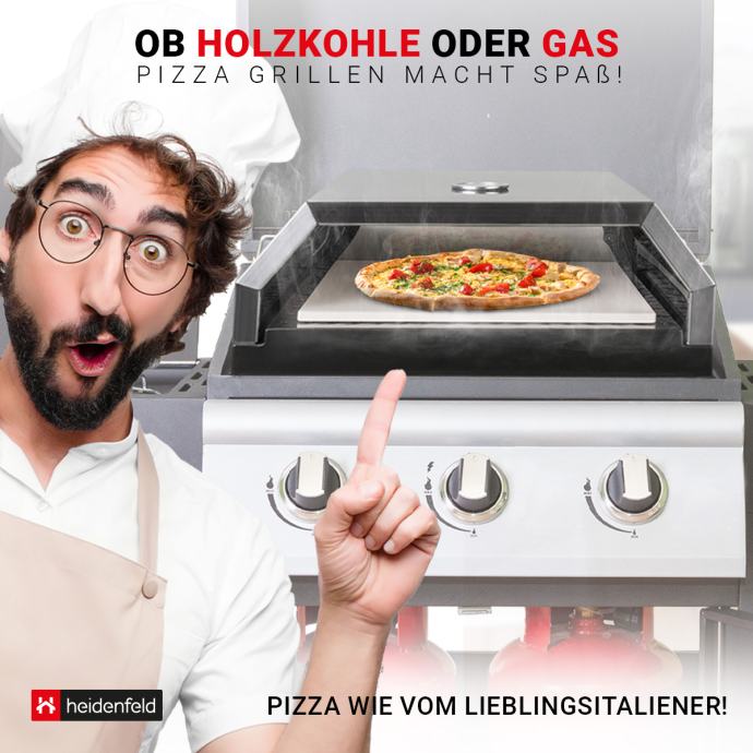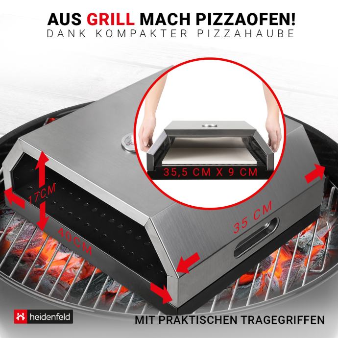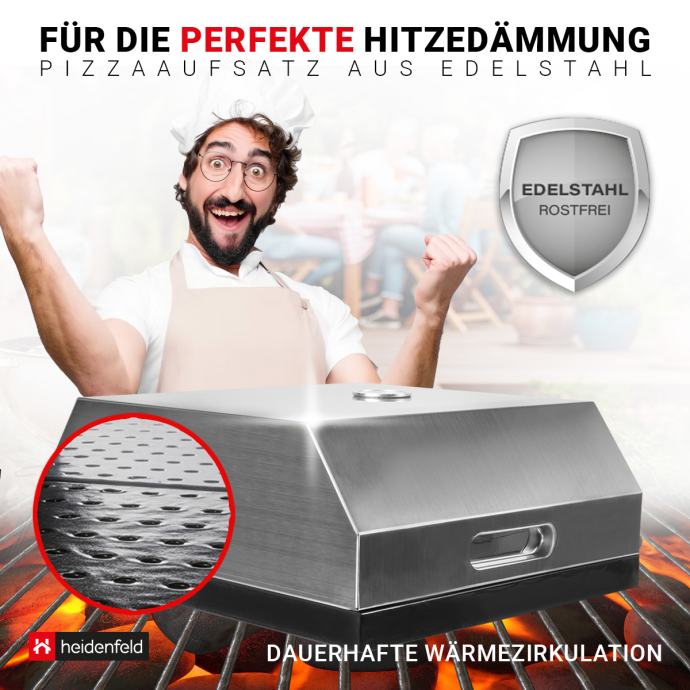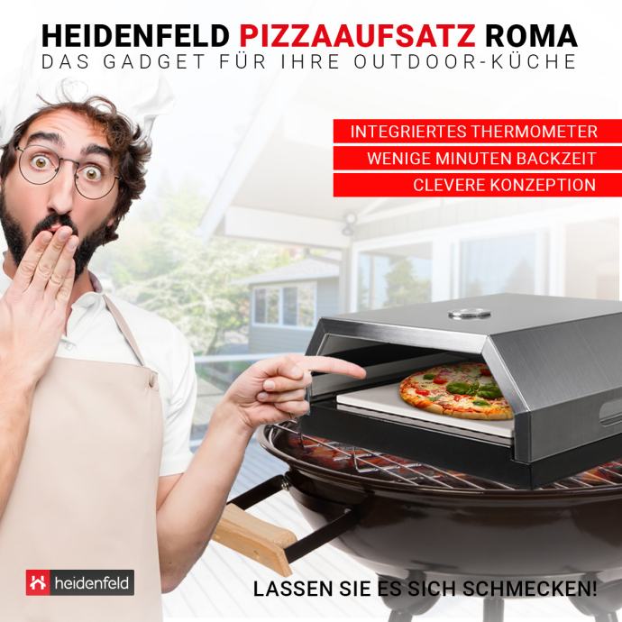S Heidenfeld Roma nastavkom za pizzu, svoj roštilj možete pretvoriti u pećnicu za pizzu u tren oka. Navlaka za pizzu jednostavno se postavi na rešetku i spremni ste za rad. Naravno, roštilj mora biti dovoljno velik: s dimenzijama od 35 cm duljine, 40 cm širine i 17 cm visine , nastavak za pizzu namjerno je kompaktan.