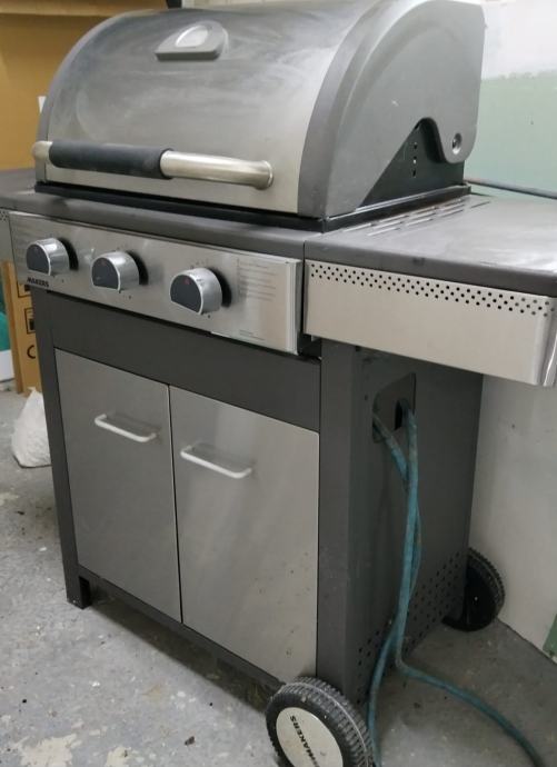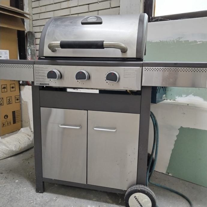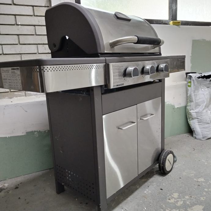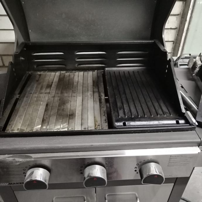 Prodajem plinski roštilj Makers, u super stanju, velika rešetka 2/3 inox rešetka( originalno bile gradele pa je umjesto njih stavljena inox široka rešetka) a 1/3 gusnata ploća. Roštilj ima 3 plamenika koji se mogu koristiti neovisno a pale se elektronski Sa svake strane prostrani dio za odložit zdjelu i pribor a ispod prostrani ormarić. Roštilj može lagano mijenjati poziciju zbog dva kotača!