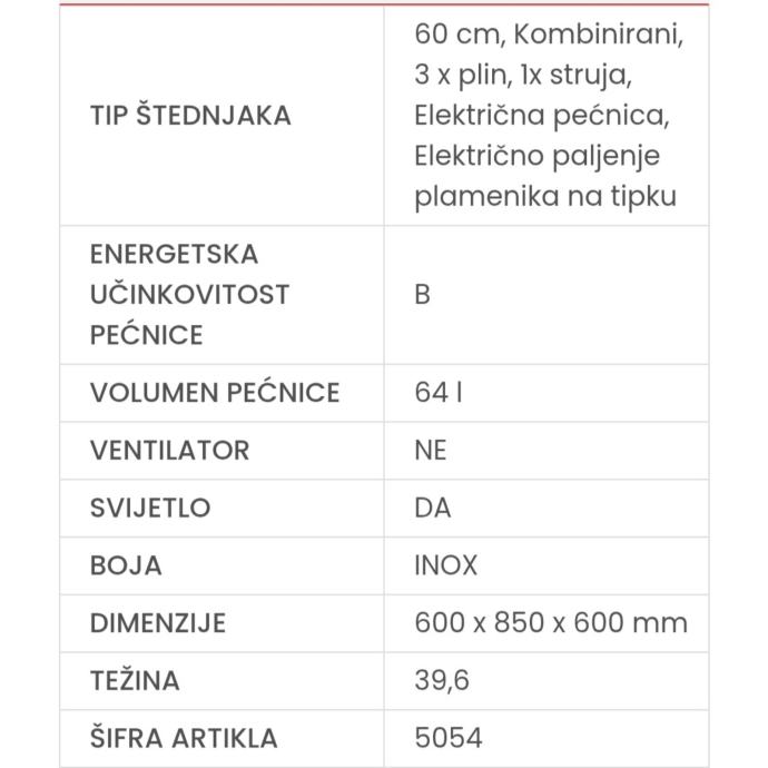 Prodajem Quadro rabljeni plinski štednjak s kombiniranom površinom koja uključuje plinske plamenike i električnu ploču. Štednjak ima funkcionalnu pećnicu.
