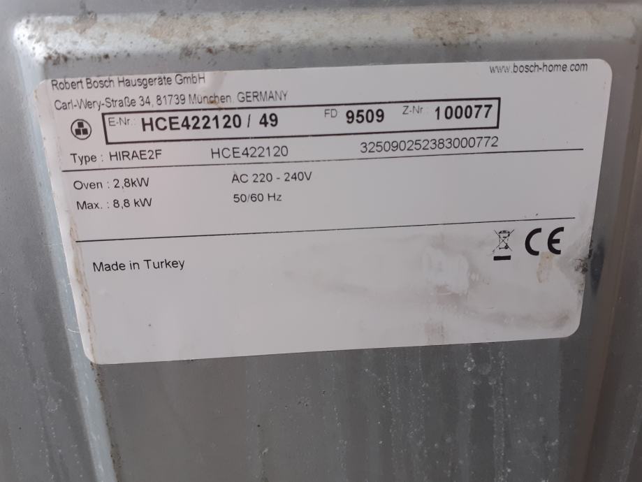 Štednjak staklo keramika Bosch type:HIRAE2F,HCE422120/49.Ispod stakla vrlo brzo užare se sva 4- kola,ako se ukljuće, snaga ukupna 8,8kw,od toga pečnica 2,8 kw.donji grijač nevalja može se nabaviti,lako ga je ugraditi.Prodaje se u Maksimiru u Barutanskom jarku prije Kauflanda.