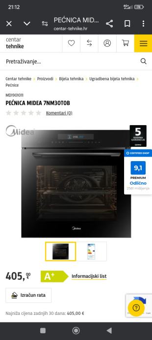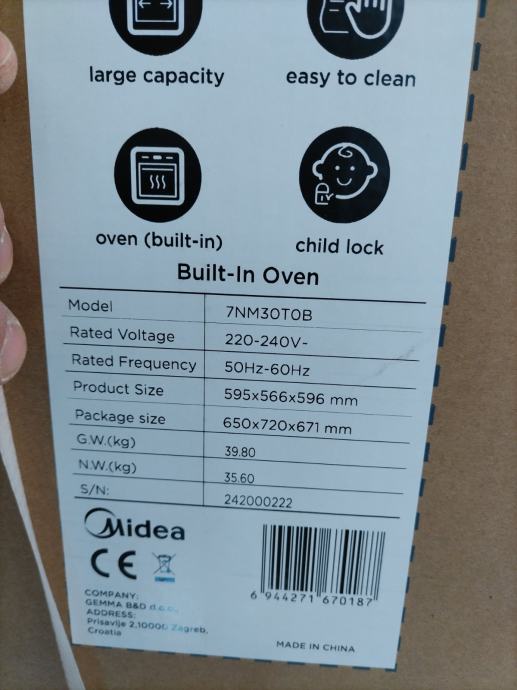 Prodajem novu ugradbenu pećnicu Midea 7NM30T0B. Ista je upakirana u originalnoj ambalaži. Dobivena uz kupljenu kuhinju. Pećnica ima račun i važeću garanciju, upakirana u originalnoj ambalaži. Cijena 290,00 eura. Oglas je iz usluge, sve informacije isključivo na mobitel broj 098675862
