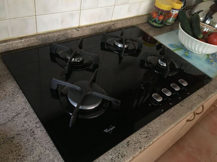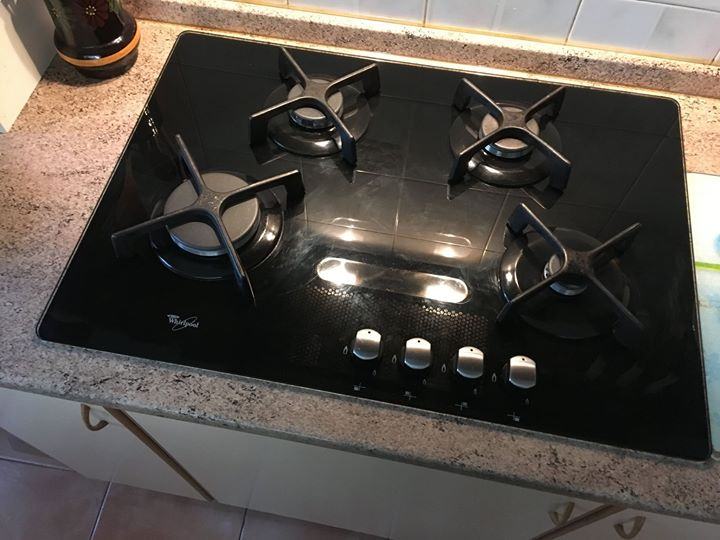 Whirpool ugradbena ploča za kuhanje na plin + plinska boca. Dimenzije. Dimenzije otvora na radnoj ploči za ugradnju cca: 55x50 cm. Gornja staklena ploča dimenzije: širina 73 cm x dubina 51 cm, udaljeni plamenici, (praktično kuhanje velikim tećama i s više teća istovremeno)