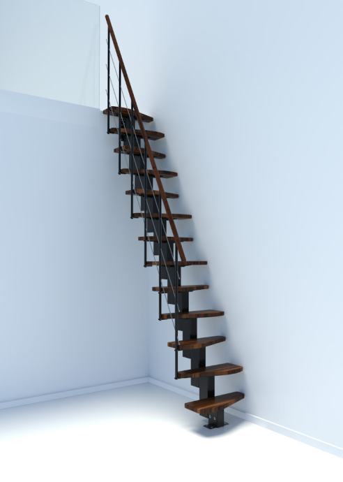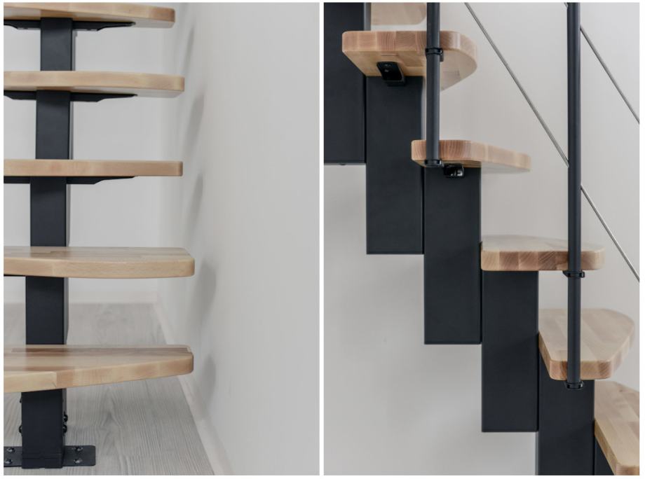 Komplet stepenica standardno se isporučuje u ravnoj verziji, boja konstrukcije srebrna ili crna, sa bukovim lakiranim gazištima.