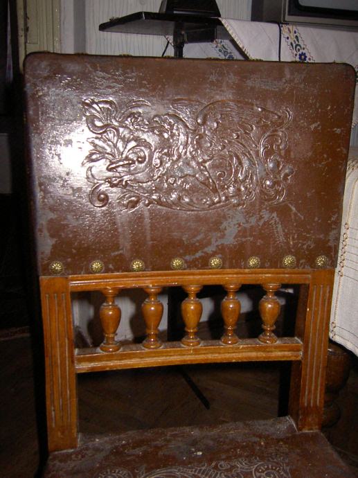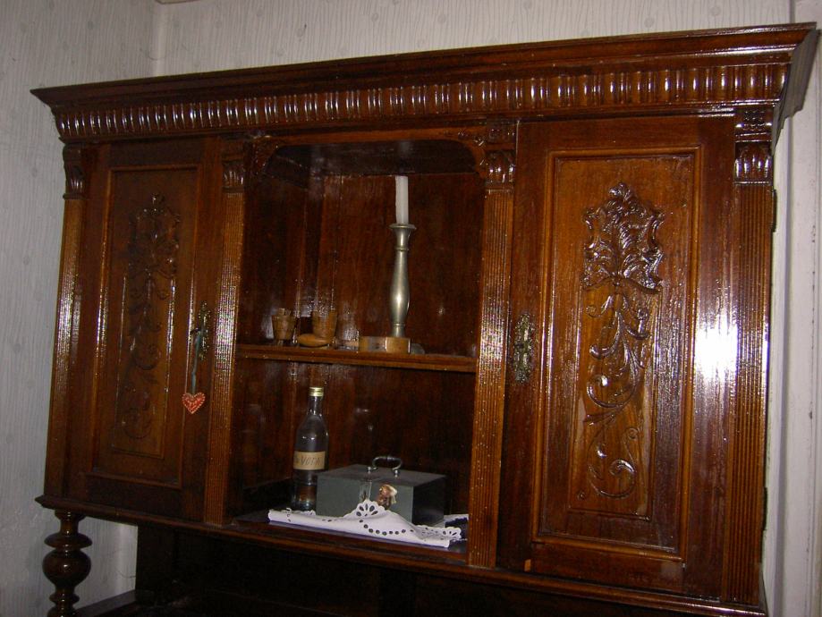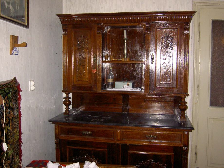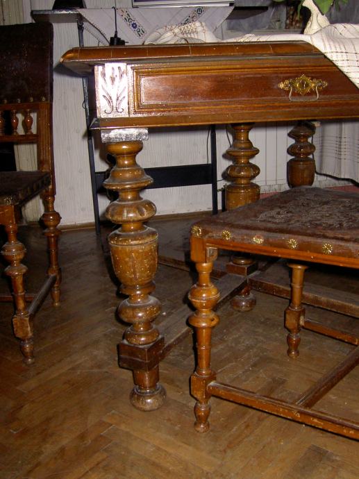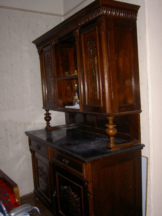Alt Deutsch kredenec u dva dijela s mramornom ploćom, drveni rezbareni stol s 4 stolice koje su nasloni i sjedalo presvučeni kožom s otisnutim ornamentom orlove glave.