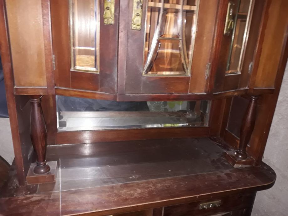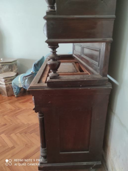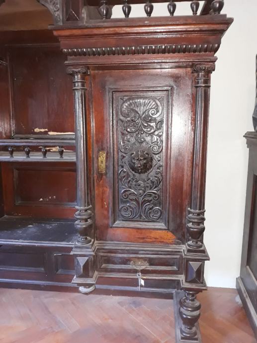 - Regal-komoda velika stilska s antickim stupovima i lavljim glavama sa izrezbarenim detaljima (donji dio d166/v91/š60, gornji dio d165/v155/š43) ukupno d165/v266/š60