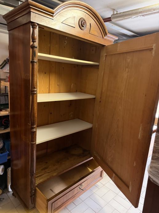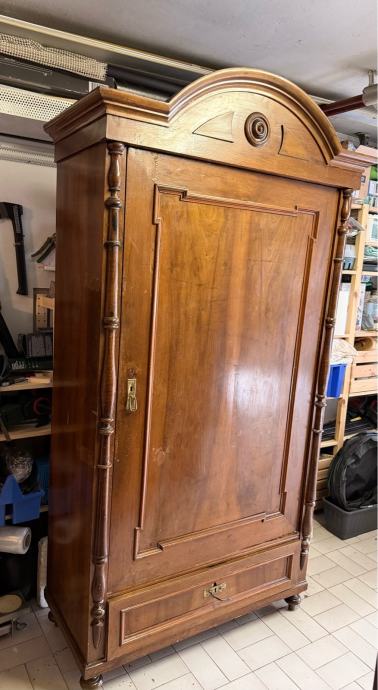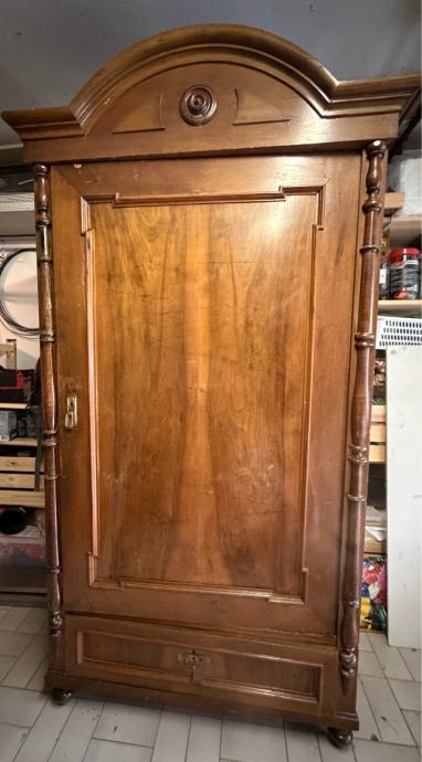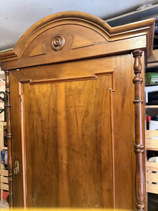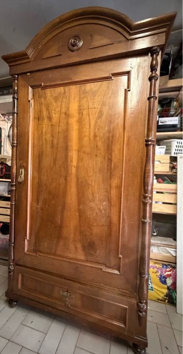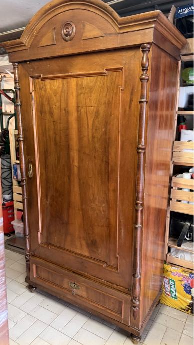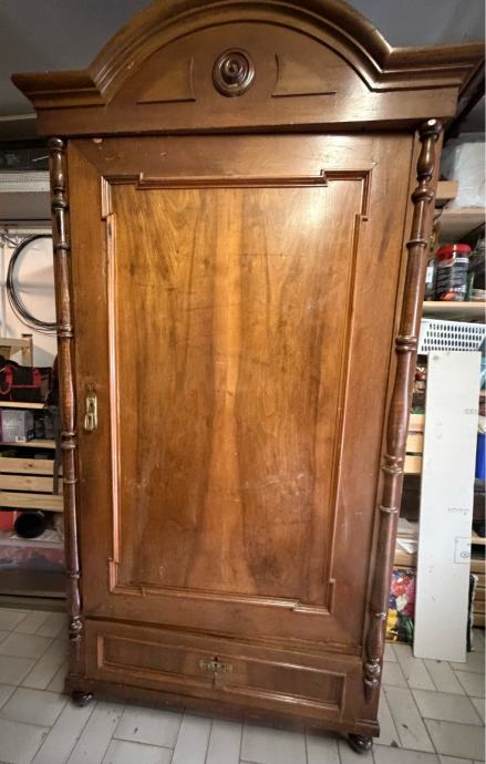Prodajem antikni drveni ormar izrađen od punog drveta tople smeđe boje. Ormar odlikuje karakteristična zaobljena kruna s dekorativnim rezbarijama i središnjim okruglim ukrasom, tornjevima s bočnih strana te jednim velikim panelni vratima. Na dnu se nalazi ladica s metalnom ručicom. Noge su u obliku kuglica, što je tipično za stariji stilski namještaj. Radi se o solidnom i masivnom komadu namještaja s puno karaktera i starinskog šarma, prekrasno će se uklopiti u svaki prostor.