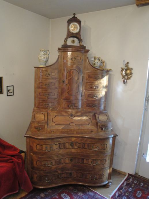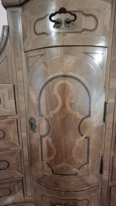 Prodajem antikni ormar (tabernakl), bogato ukrašen intarzijama, zajedno s starinskim satom.