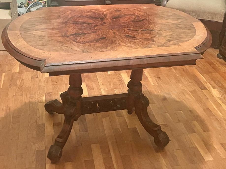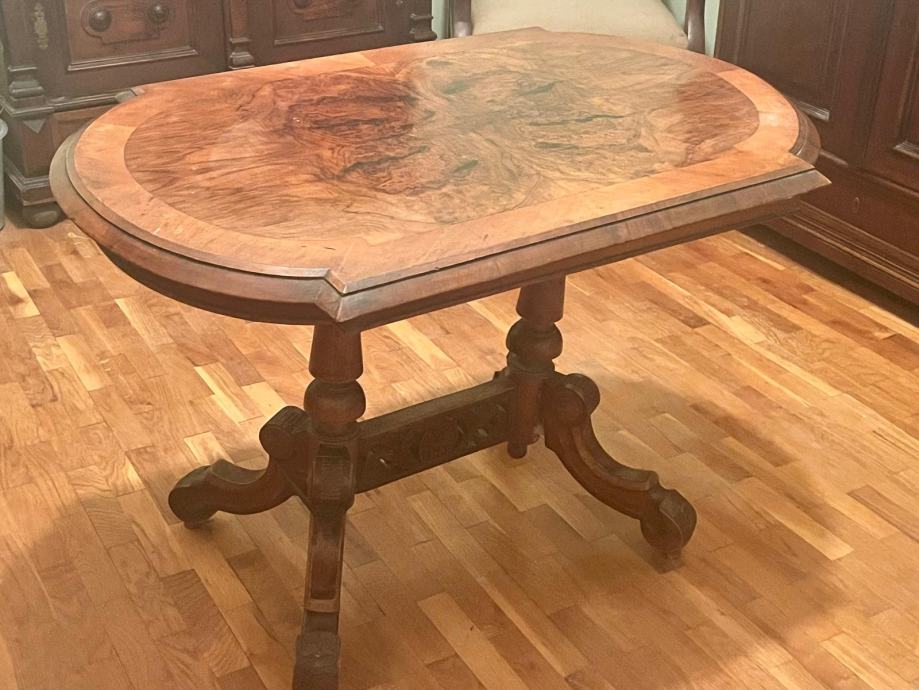Stol je izrađen od kvalitetnog drveta (orah ili orahov furnir) s lijepim uzorkom na ploči i dekorativnim nogama.