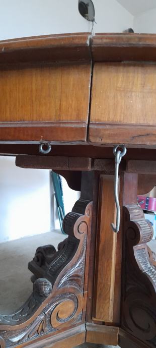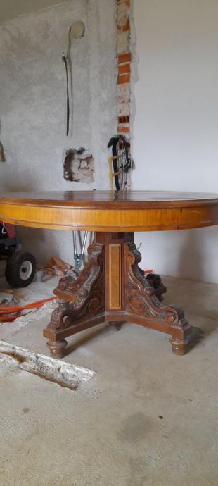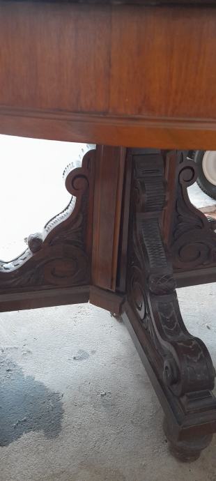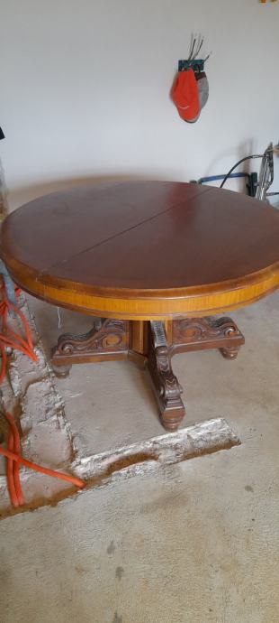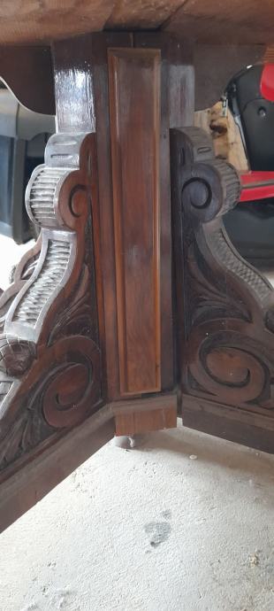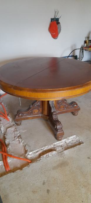 Prodaje se masivni drveni stol, puno drvo (trešnja, orah), sa zanimljivim i bogato ukrašenim donjim djelom. Stol je očuvan. Promjer stola je 120 cm.