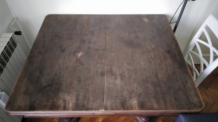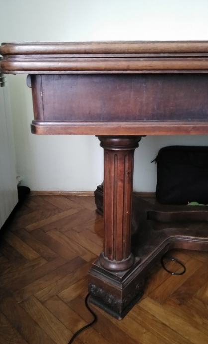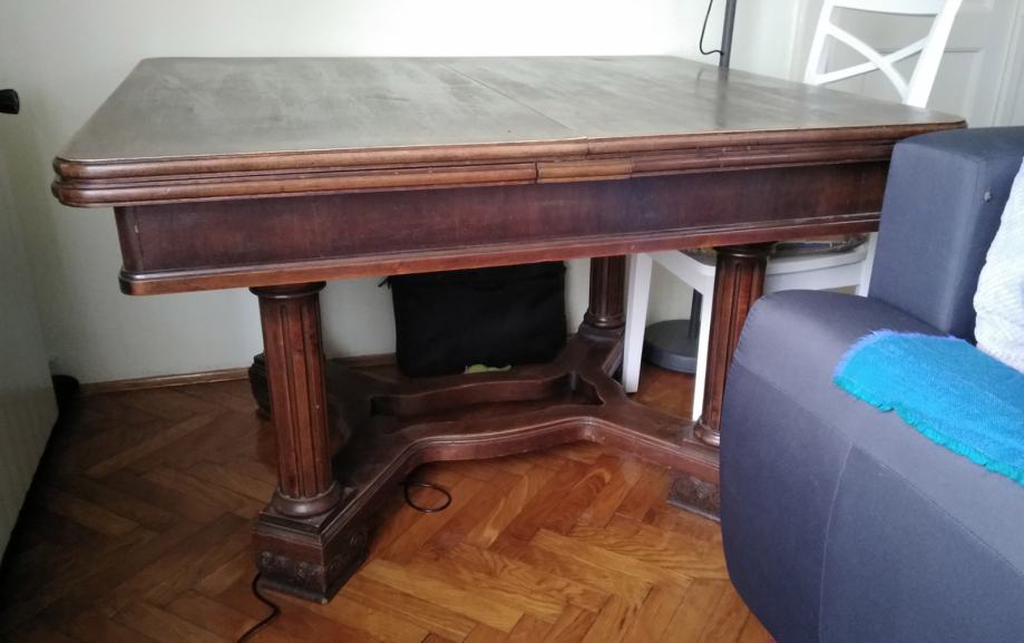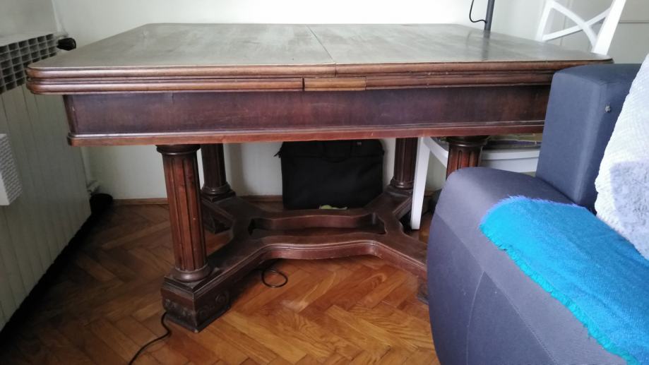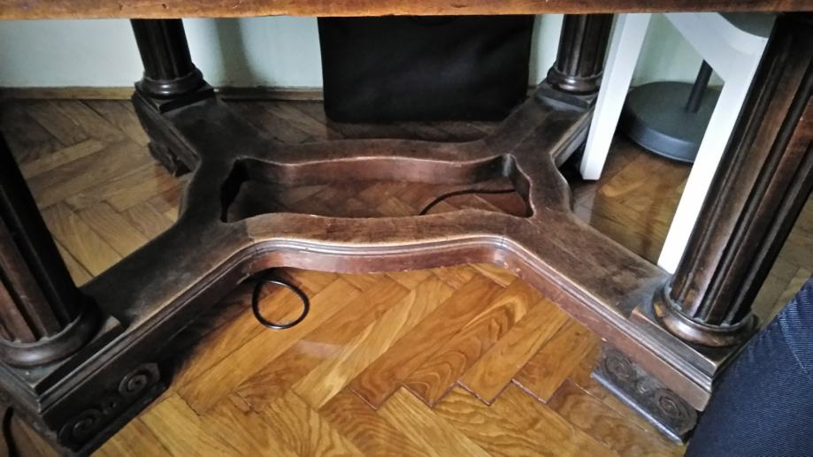 Masivni drveni stol sa zanimljivo i bogato ukrašenim donjim dijelom. Stol se može razvući (proširiti) po potrebi pomoću umetka u sredini.