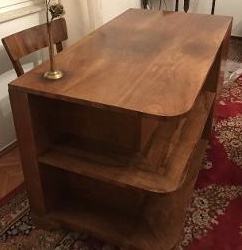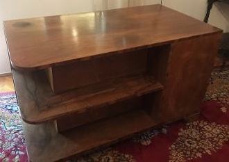 Originalni art deco pisaći stol od orahovine. Ima ladicu sa ključem i odjeljak za dokumente isto sa ključem. Bio bi idealan za odvjetnički ured ili slično. Vaneer je na nekim mjestima potamnio/izbljedio zbog čega je cijena znatno snižena.
