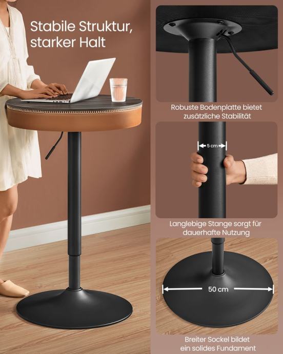 Ovaj barski stol iz kolekcije VASAGLE EKHO ima bogatu teksturu umjetne kože i fine šavove koji demonstriraju umijeće izrade, stvarajući dom koji mnogo govori o vašem stilu. Ovaj okrugli stol za odlaganje može se lako podesiti od 83 do 105 cm i idealan je za blagovaonicu, kuhinju ili dnevni boravak. Idealan je za ležerne obroke i okupljanja. Iskusite kako je jednostavno postaviti vaš novi stolić za kavu. Zahvaljujući jednostavnoj strukturi, uključenim alatima i preciznim uputama. Vaš barski namještaj podesiv po visini spreman je za upotrebu uz minimalan napor. Ovaj stol ima pretinac dubok 4,8 cm u koji možete pohraniti pribor za jelo i olovke. Držite svoje najvažnije stvari pri ruci i izvan vidokruga kako bi vaš dom bio uredan. Oslonite se na robustan dizajn našeg smeđeg barskog stola sa čvrstom bazom od 50 cm koja osigurava iznimnu stabilnost. Dugotrajna podloga bez klimanja za svakodnevnu upotrebu. Za sve informacije nazovite na broj telefona 092/399-75-19