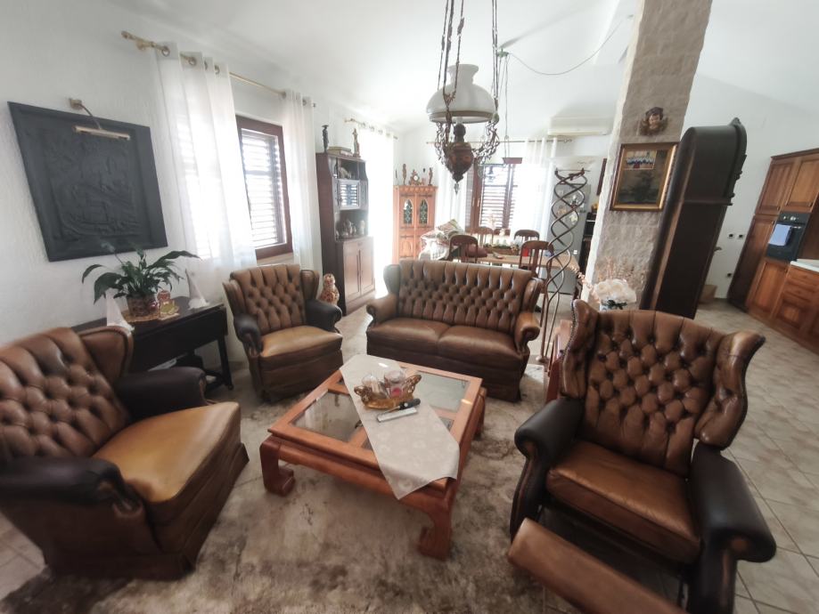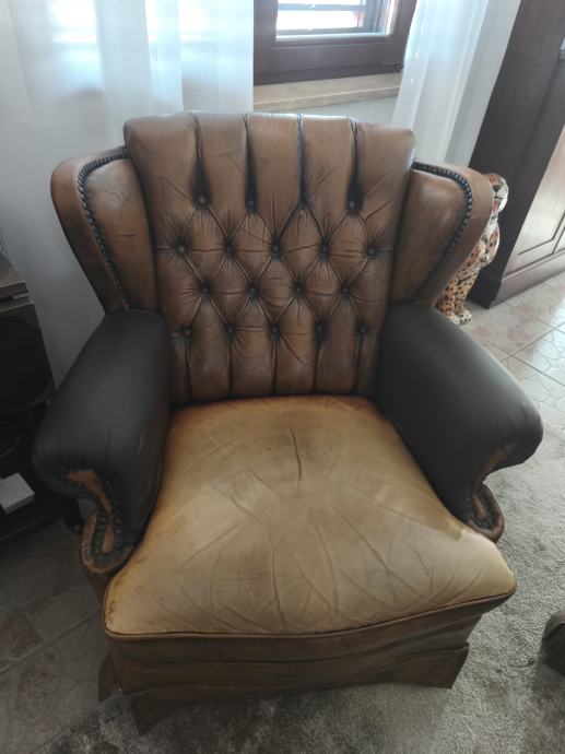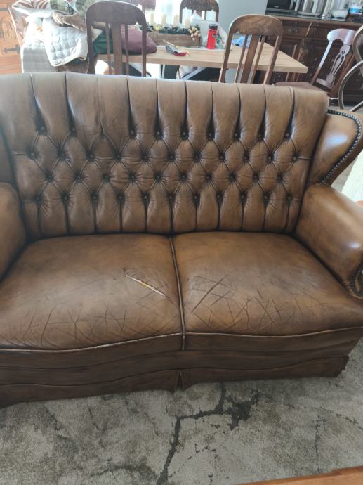 Napomena: dvosjed ima puknuće kože na sjedalu. Konstrukcija je čvrsta ali je potrebno presvlačenje sjednog dijela ili popravak kože.