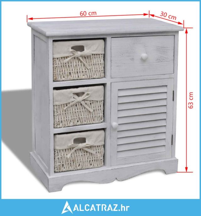 Uz tri pletene košare, ovaj izdržljivi drveni ormarić pruža vam dovoljno prostora za spremanje vaših dragocjenosti, a istodobno unosi seoski stil u vašu prostoriju. Naš drveni ormarić sigurno će biti jedan od vaših omiljenih komada namještaja u bilo kojoj prostoriji.