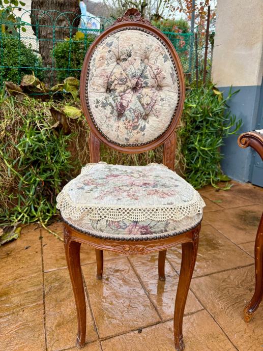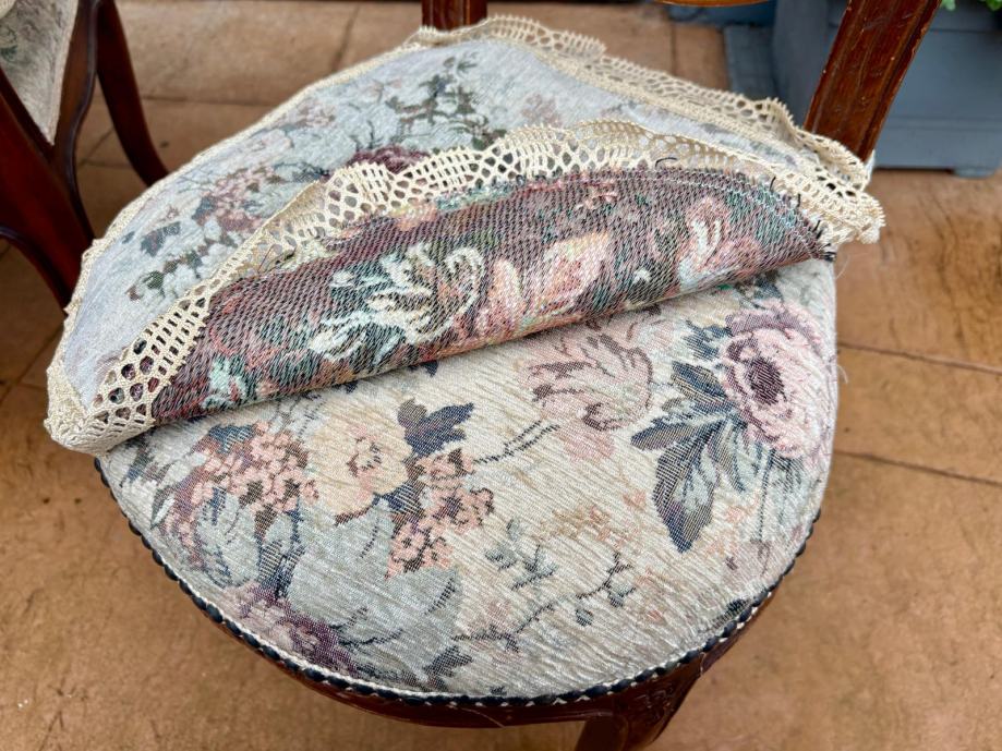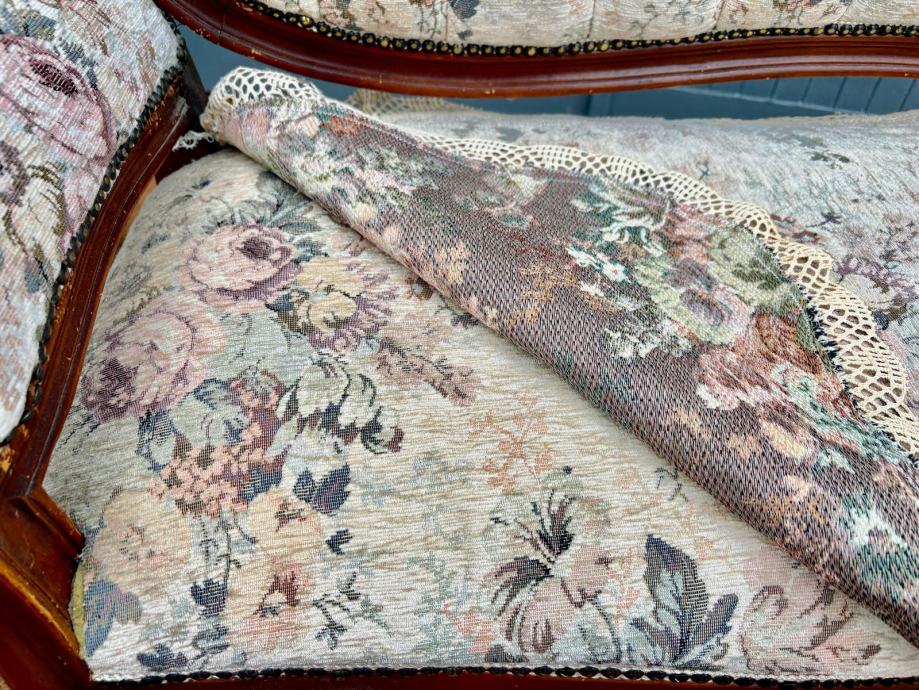 Tkanina i detalji: Posebnost ovog seta je što posjeduje originalne zaštitne navlake s čipkom za sjedišta, što je prava rijetkost na tržištu. Ispod navlaka nalazi se kvalitetna tkanina s raskošnim cvjetnim uzorkom (jacquard/tapiserija), koja je u izvrsnom stanju. Nasloni su rađeni u "capitonné" stilu (s gumbima), što pruža dodatnu dozu luksuza i udobnosti.