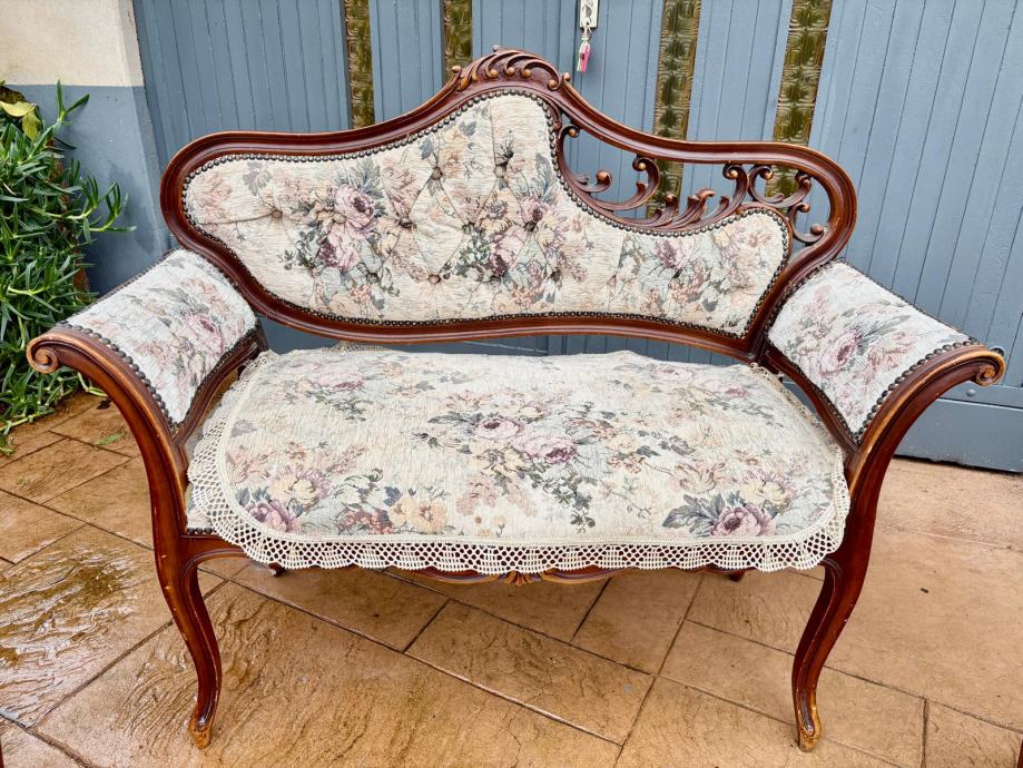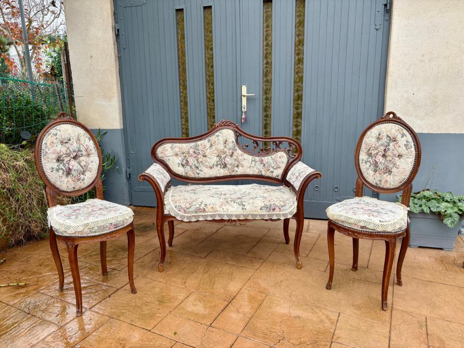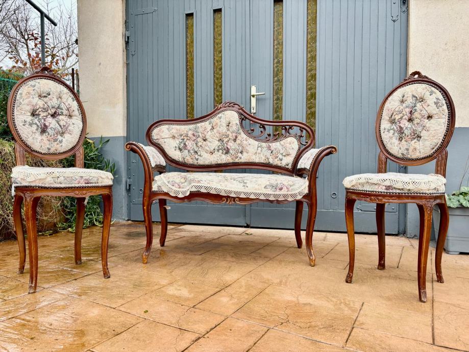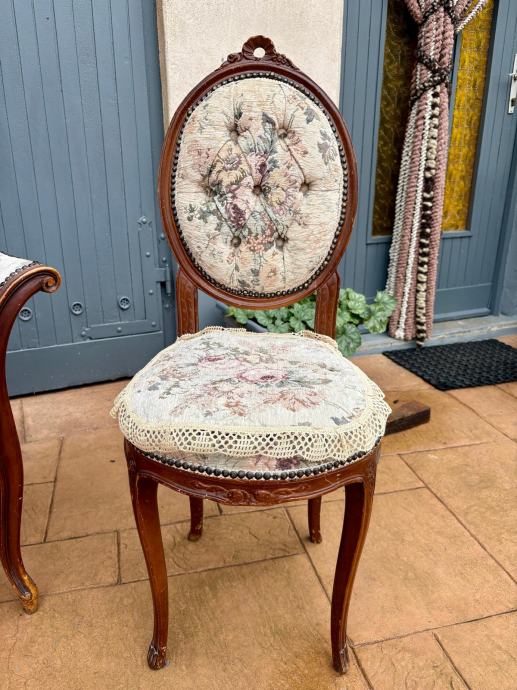 Na prodaju je izuzetno očuvan, autentičan salonski set iz 1920-ih godina, koji predstavlja vrhunac elegancije i zanatske vještine tog razdoblja. Ovaj set, koji se sastoji od unikatne sofe asimetričnog dizajna i dvije pripadajuće stolice s "medallion" naslonom, savršen je primjerak za ljubitelje vrhunskog antiknog namještaja.