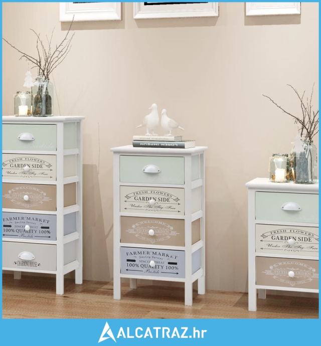 Ovaj ormarić s ladicama ima 4 ladice koje glatko klize te pružaju dovoljno prostora za pohranu vaših osobnih stvari i pomažu u održavanju uredne sobe. Ladice sa starinskim tradicionalnim uzorkom u seoskom stilu dodaju ruralni šarm ormariću. Ladice se mogu mijenjati. Također možete izložiti stvari poput fotografija, knjiga i lončanica na vrhu ormarića za hodnik. Napravljen od visokokvalitetnih materijala, bočni ormarić izdržljiv je i jednostavan za čišćenje.