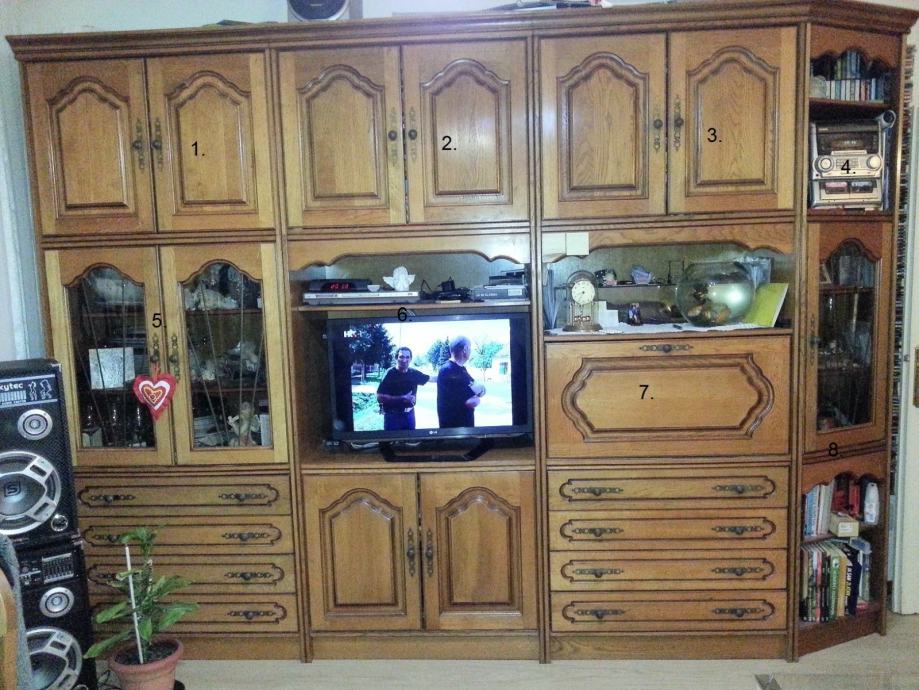 Prodajem regal,fronte slavonska hrastovina,star 20 godina u odličnom stanju,može i po elementima i to minimalno 1 donj element i 1 gornji element.Donji elementi su dimenzija 158 V 88 Š 52 D ,kutni elemenat je 158 V 42 Š 52/35 D