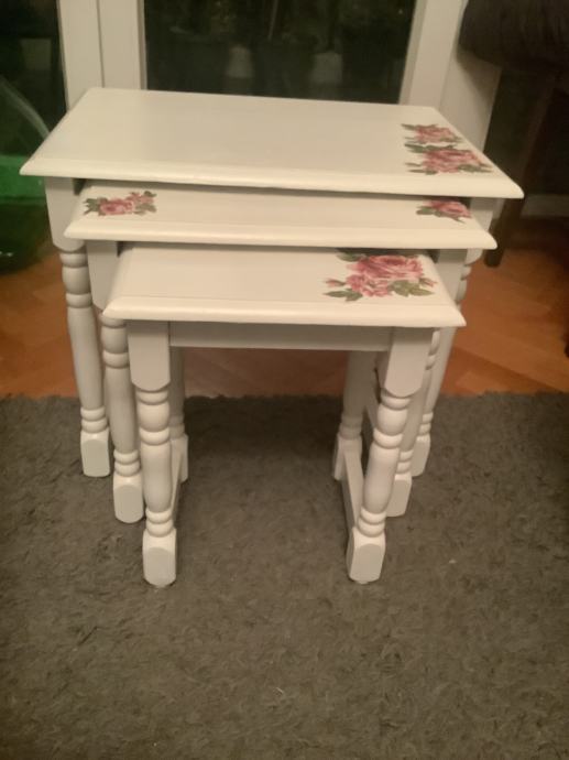 Komplet od 3 hrastova stolića obojana u bijelu boju se dekupažem.