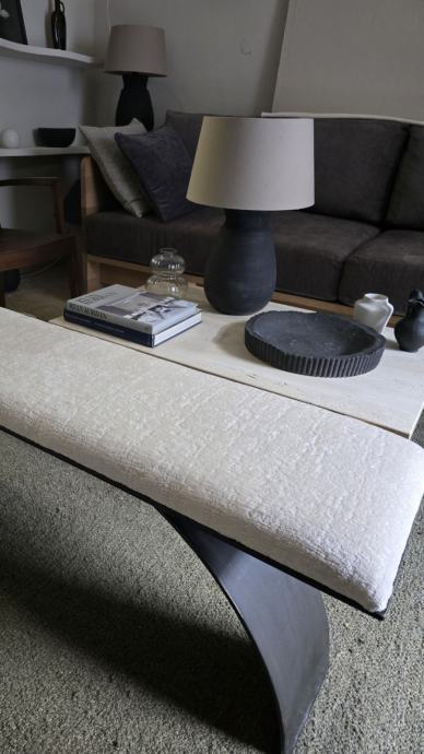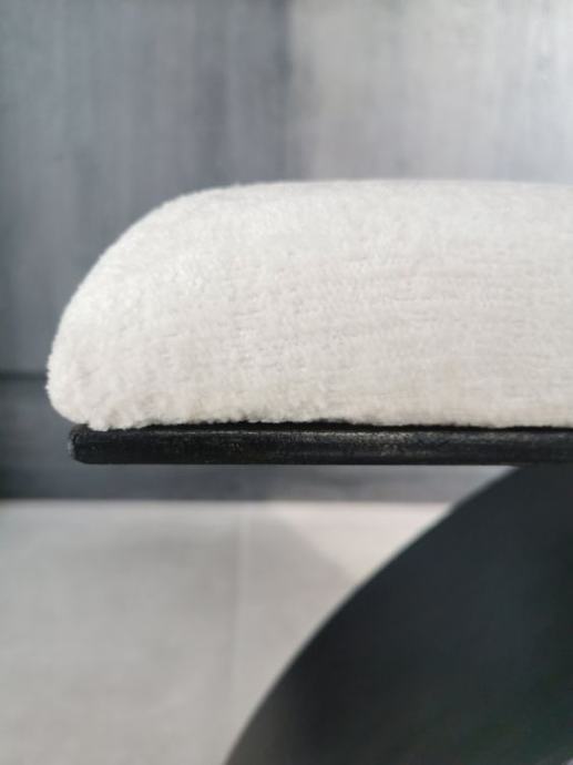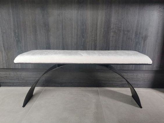 Klupa skulpturalnog oblika, metalna baza i sjedeći dio je ručno tapeciran sa prekrasnom tkaninom.