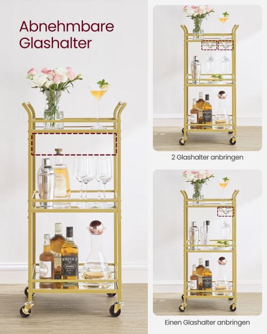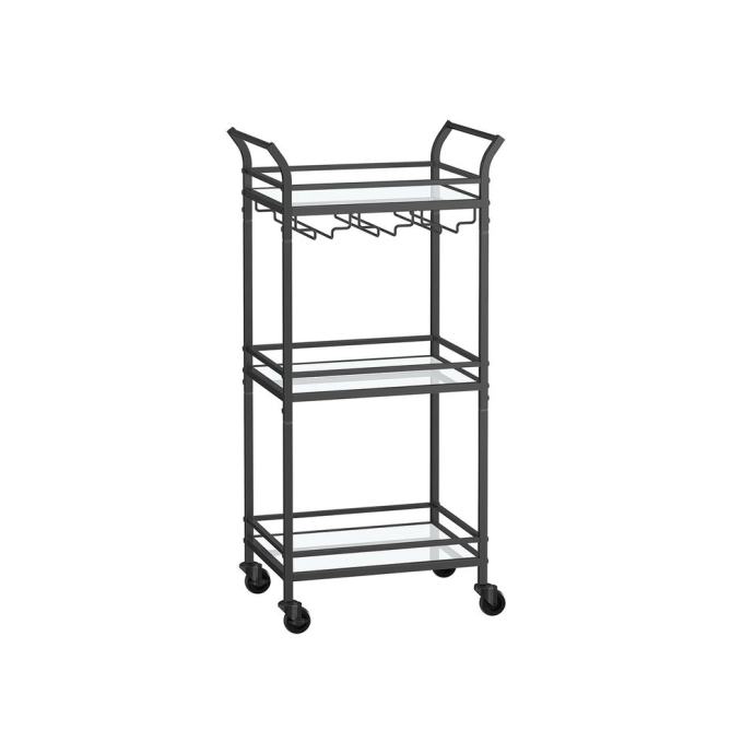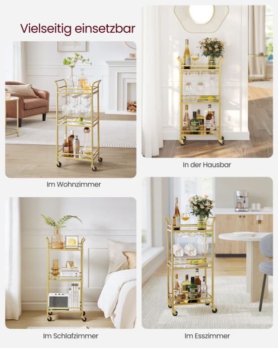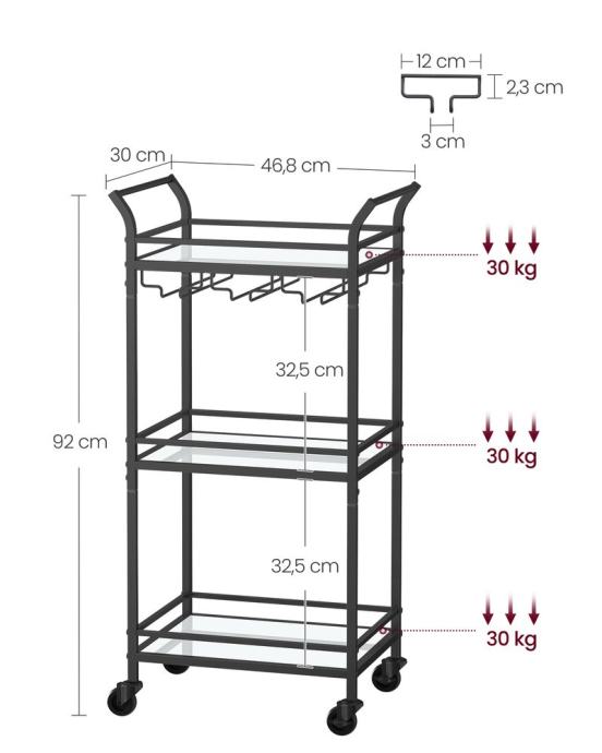 Staklene police s ogledalima daju ovim kolicima za posluživanje atraktivan šarm. Oni prekrasno odražavaju vaše vinske čaše i boce i unose bezvremensku eleganciju u vaš dom. Ova kolica dolaze s 3 držača za čaše kako bi vam naočale bile pri ruci. Osim toga, svi držači za čaše se mogu ukloniti, što znači da ih možete pričvrstiti po potrebi. Izrađena od čeličnog okvira i izdržljivog stakla koje se lako čisti, ova kolica su čvrsta, stabilna i izdržljiva. Ova uska kolica (30 x 46,8 x 92 cm) savršeno se uklapaju u uske niše u kuhinji, kupaonici, radnoj ili spavaćoj sobi. S ovim kolicima možete optimalno iskoristiti svoj prostor i povećati prostor za pohranu. S 4 kotačića rotirajuća za 360° i zakrivljenim ručkama, možete gurati ova kolica kamo god trebate. 2 kotača opremljena su kočnicama tako da kolica možete fiksirati na jednom mjestu. Za sve informacije nazovite na broj telefona 092/399-75-19