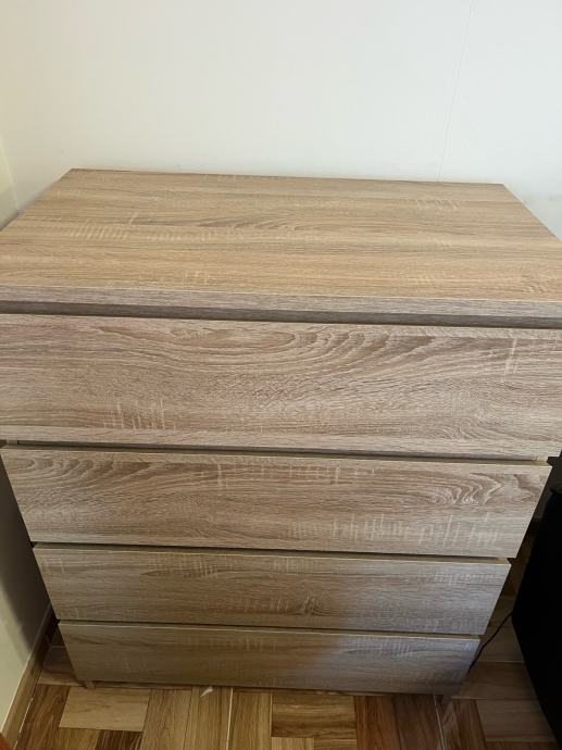 Prodajem komodu s četiri ladice u dekoru svijetlog hrasta. Ladice se glatko otvaraju i zatvaraju, a komoda pruža solidnu količinu prostora za odlaganje. Neutralna boja i jednostavan dizajn uklapaju se u različite stilove uređenja.