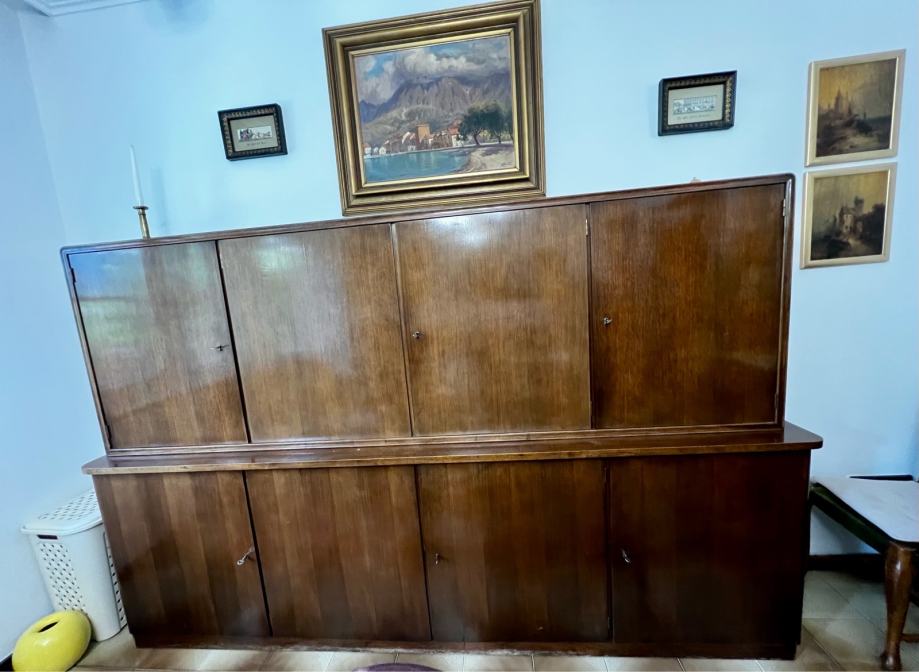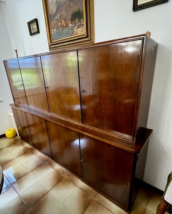 Jedinstvena masivna komoda iz 1920.-tih. Ovaj primjerak Secesije se teško može naći. Izrađena je od punog drveta, tamno smeđe lak boje, visine 150 cm, dužine 255cm i dubine 44cm ( gornji elementi dubina 28cm, a donji 37cm). Svih 8 ormarića posjeduje bravu sa ključem i sve je u funkciji.