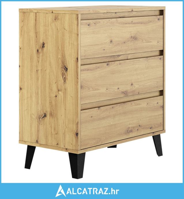 Materijal: laminirani DTD Boja: hrast umjetničkog stila Dimenzije (ŠxDxV): 70x38,8x78,4 cm Visina baze od poda: 12 cm Tri ladice Veličina ladice (ŠxDxV): 66,2x18 cm Unutarnje dimenzije ladice (ŠxDxV): 60,8x33,3x9 cm Na nogama Boja nogara: crna Nosivost ladice: 5 kg Nosivost gornje površine: 15 kg Moderan stil Bez ručki Preporučujemo pričvršćivanje na zid Isporučuje se rastavljeno ---------------------------------------------------------------------