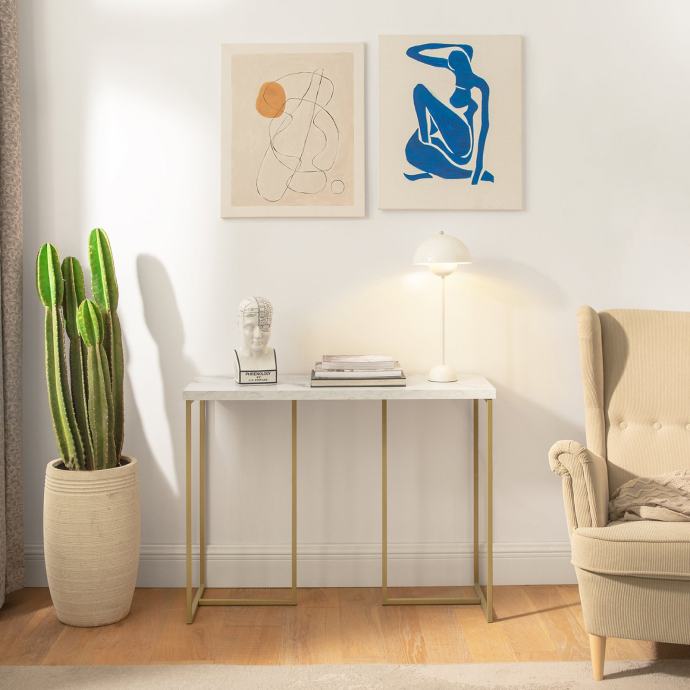 Sa svojim mramornim furnirom na stolu i mat zlatnim okvirom, ovaj konzolni stol nudi suptilan glamurozan izgled vašem domu. Pristaje vašoj sobi i dodaje eleganciju i modu vašem dekoru, savršeno za opuštajući trenutak. Za sve informacije nazovite na broj telefona 092/399-75-19