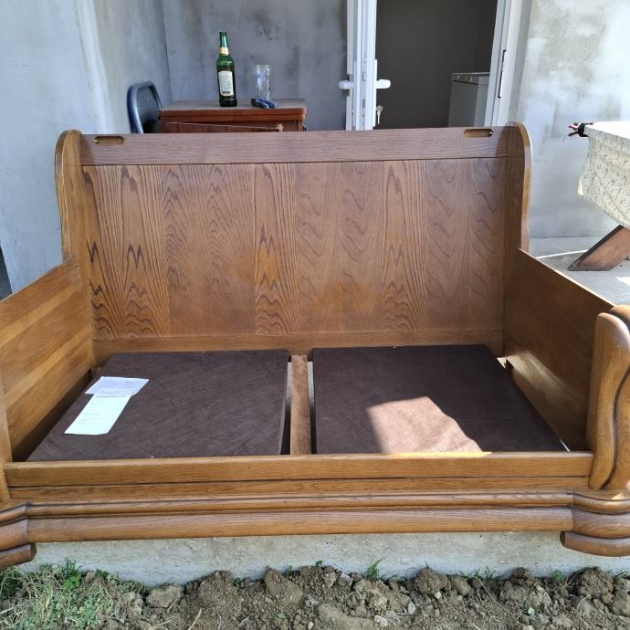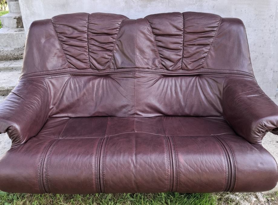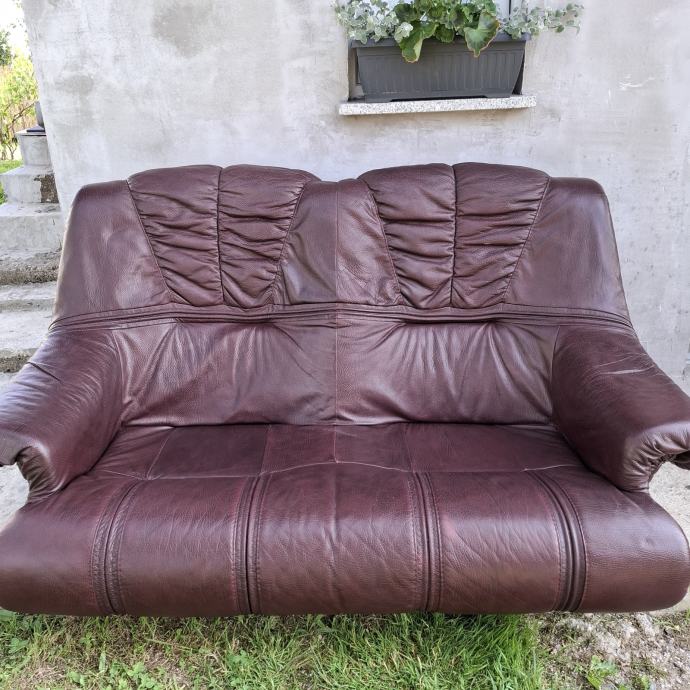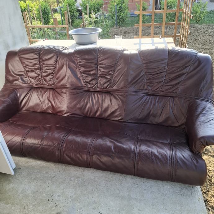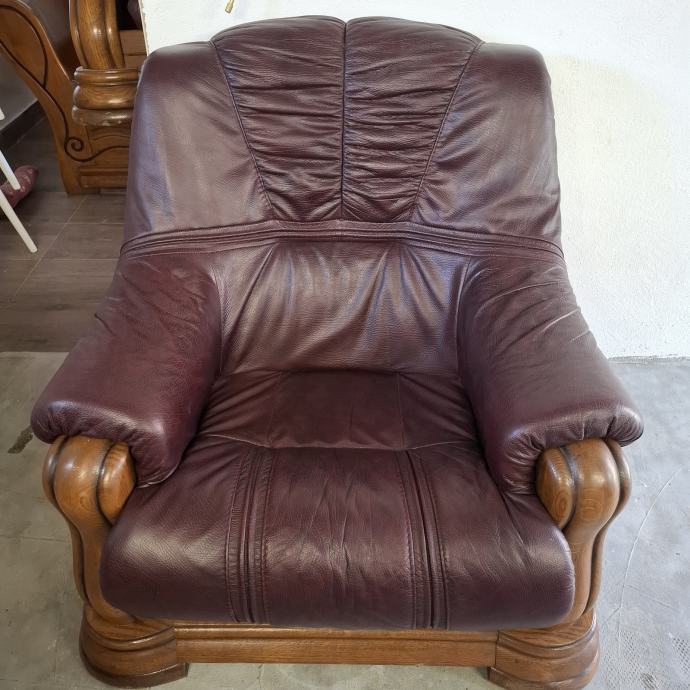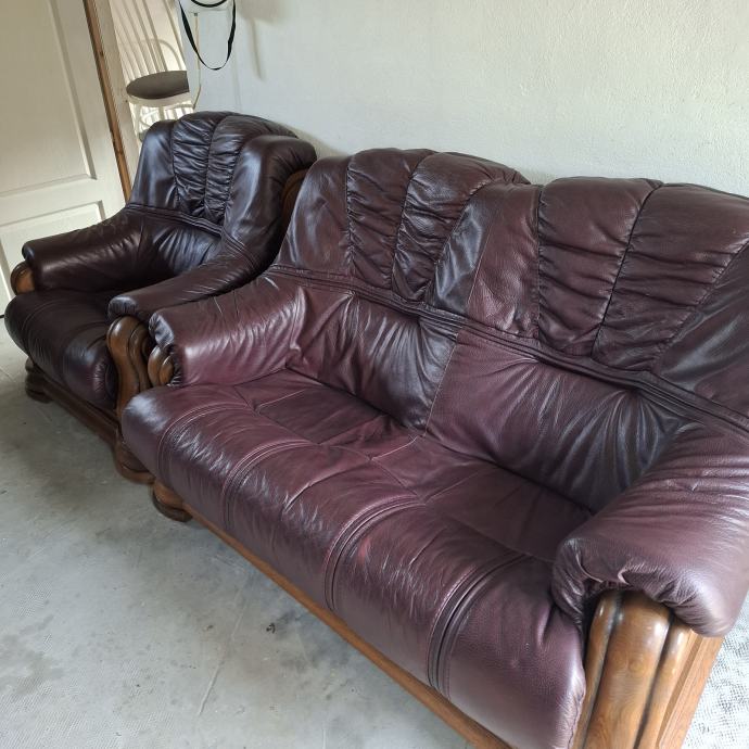 Prodaju se trosjed, dvosjed, fotelja i stol od hrastovine i kombinacije tamno crvene kože.