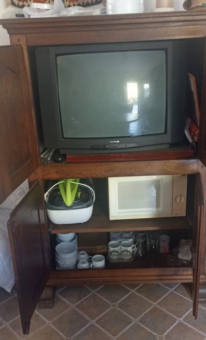 Dimenzija: 153x106x52cm. Uvezeno iz Holandije. Gornji ormarić je na TV-u. (vidi fotografiju). Dodat ću TV sa slike besplatno.