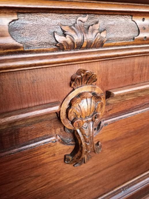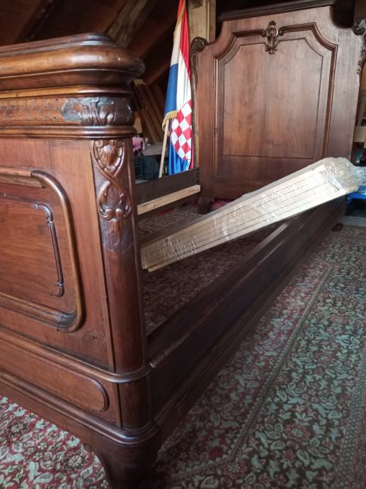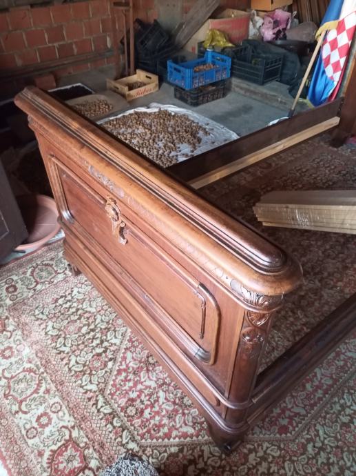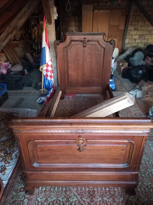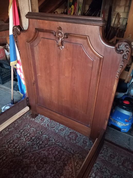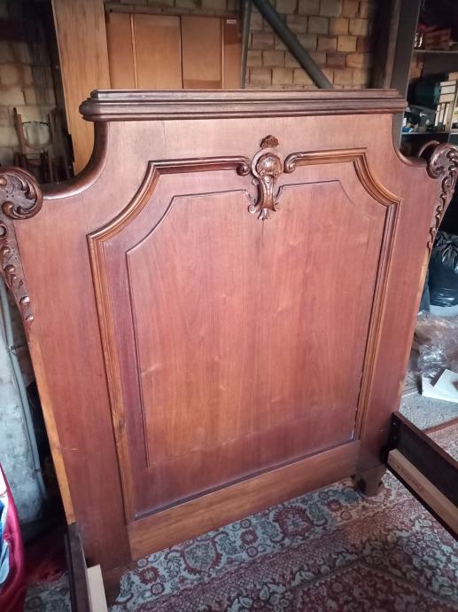 Masivni krevet, drvo orah. Stručno obnovljen. Visina uzglavlja 135cm, visina donožja 90cm. Za madrac dimenzija 100x200cm. Podnica od obrađene jelove daske. Mogućnost dostave i sastavljanja prema dogovoru.
