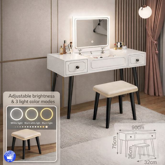 Elegantna mizica za ličenje z integriranim LED ogledalom, praktičnimi predelki in udobnim stolčkom – vse, kar potrebujete za urejen, moderen beauty kotiček.