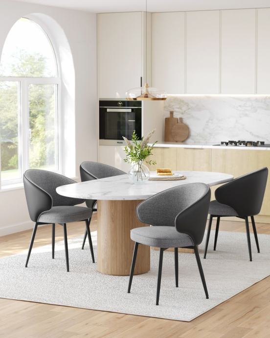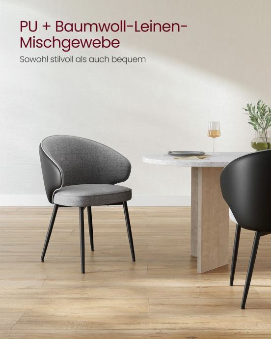 Sjedalo 44,5 x 50 cm, visoki naslon za leđa i ruke poput zagrljaja od ljubavi, jastuk debljine 8 cm i prozračna tkanina - sve to osigurava visoku udobnost sjedenja. Noge stolice izrađene su od metala, što osigurava čvrstoću i izdržljivost; sjedalo izrađeno od prozračne mješavine pamuka i lana, stražnja površina naslona izrađena od PU glatka je i laka za čišćenje. Zahvaljujući jednostavnoj strukturi, montaža se odvija u samo 2 koraka. Jednostavno zategnite 5 vijaka i stolac je spreman za upotrebu. Vrijeme je za uživanje u opuštajućim trenucima! Čiste linije, crne noge stolca i zaobljeni rubovi - kombinacija ovih elemenata daje ovim blagovaonskim stolcima atraktivan dodir i čini da oči vaših gostiju sjaje! Podesive nogice drže kuhinjske stolice stabilne čak i na blago neravnim podovima dok istovremeno štite vaš pod od ogrebotina.