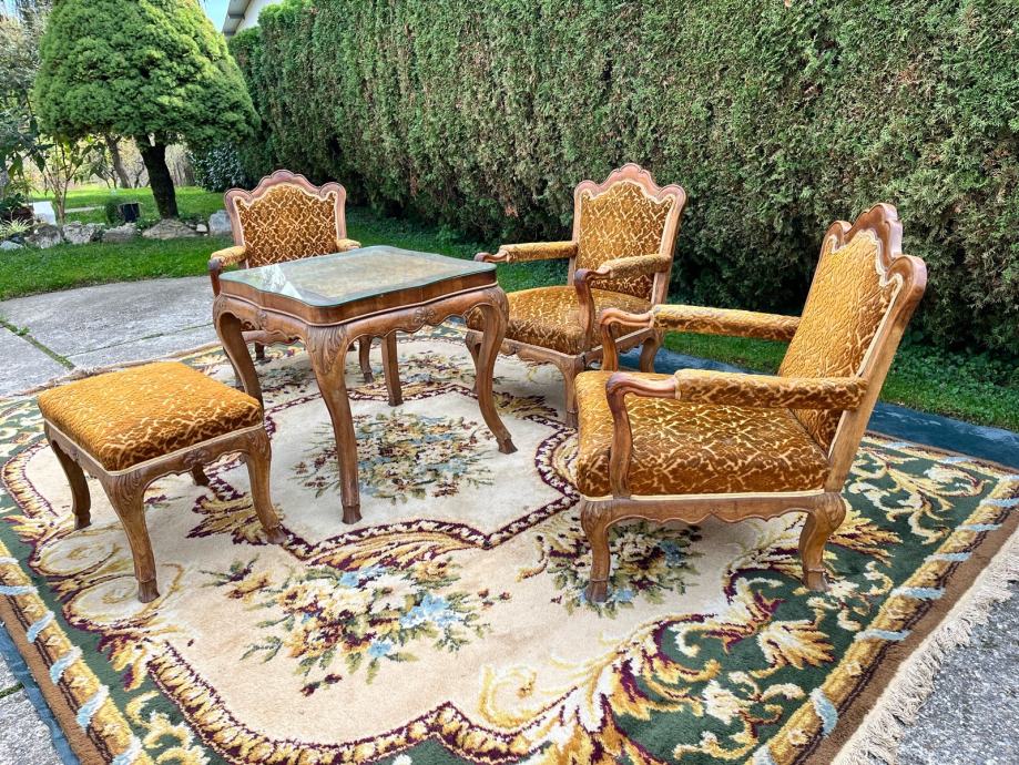 Antikvitetna neobarokna soba, komplet se sastoji od 3 x fotelje, 1 x taburea i 1 x stola.
